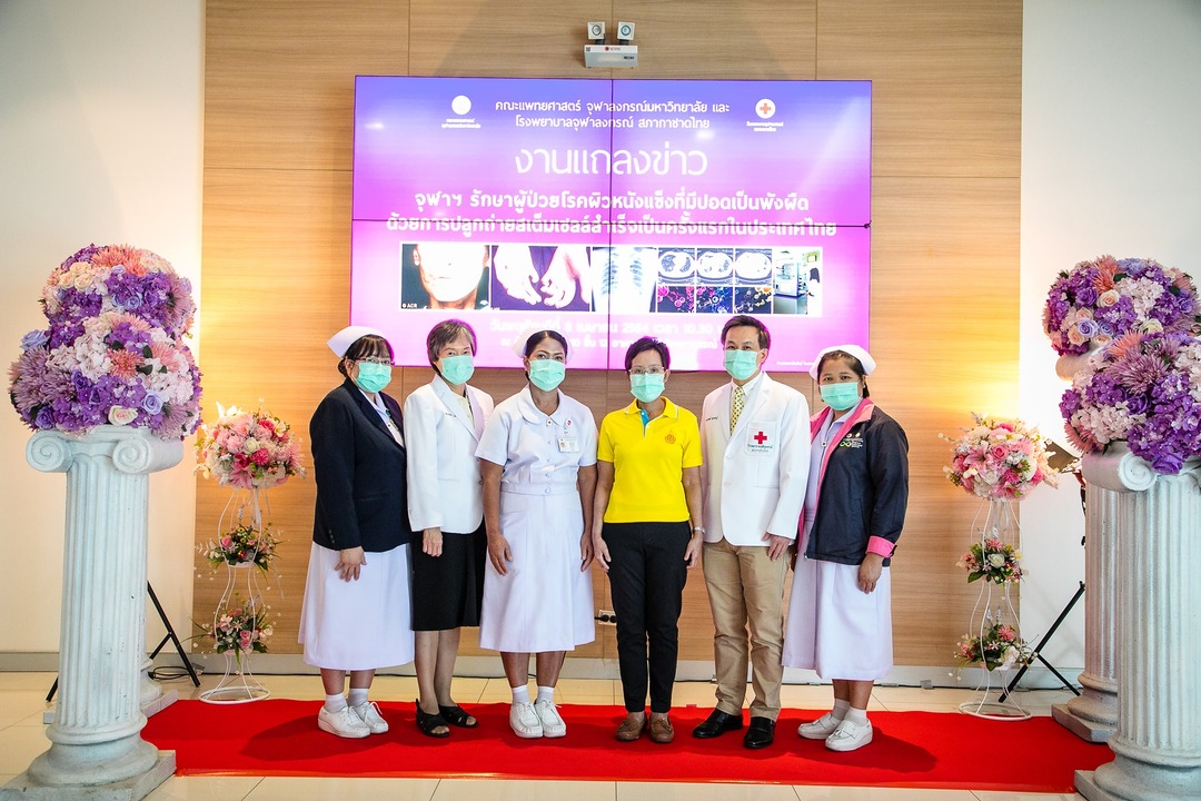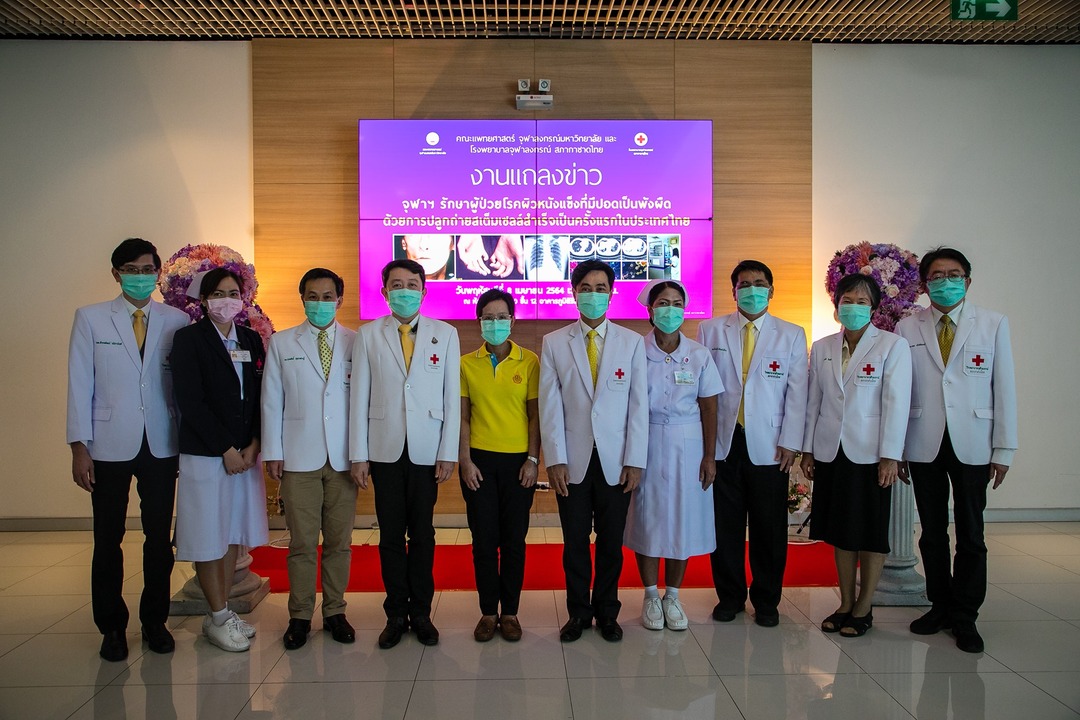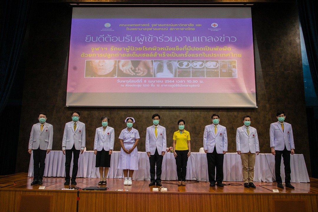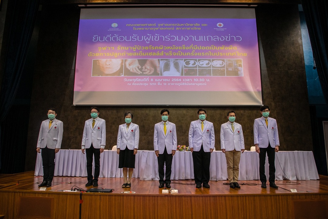 โรงพยาบาลจุฬาลงกรณ์ สภากาชาดไทย รักษาผู้ป่วยโรคผิวหนังแข็งที่มีปอดเป็นพังผืดด้วยการปลูกถ่ายสเต็มเซลล์สำเร็จเป็นครั้งแรกในประเทศไทย ศ.นพ.สุทธิพงศ์ วัชรสินธุ คณบดี คณะแพทยศาสตร์ จุฬาลงกรณ์มหาวิทยาลัย และผู้อำนวยการ โรงพยาบาลจุฬาลงกรณ์ สภากาชาดไทย ศ.นพ.ธีระพงษ์ ตัณฑวิเชียร หัวหน้าภาควิชาอายุรศาสตร์ คณะแพทยศาสตร์ จุฬาฯ ศ.พญ.มนาธิป โอศิริ หัวหน้าสาขาวิชาโรคข้อและรูมาติสซั่ม ภาควิชาอายุรศาสตร์ คณะแพทยศาสตร์ จุฬาฯ ผศ.นพ.อุดมศักดิ์ บุญวรเศรษฐ์ หัวหน้าสาขาวิชาโลหิตวิทยา ภาควิชาอายุรศาสตร์ คณะแพทยศาสตร์ จุฬาฯ รศ.นพ.กมล แก้วกิติณรงค์ หัวหน้าสาขาวิชาอายุรศาสตร์โรคระบบหายใจและเวชบำบัดวิกฤติโรคระบบการหายใจ ภาควิชาอายุรศาสตร์ คณะแพทยศาสตร์ จุฬาฯ อ.นพ.จักกพัฒน์ วนิชานันท์ อาจารย์ผู้เชี่ยวชาญโรคติดเชื้อในผู้ปลูกถ่ายอวัยวะ หน่วยโรคติดเชื้อ ฝ่ายอายุรศาสตร์ โรงพยาบาลจุฬาลงกรณ์ สภากาชาดไทย และ ผศ.(พิเศษ) นพ.สุรินทร์ อัศววิทูรทิพย์ ผู้ช่วยผู้อำนวยการฯ ด้านภาพลักษณ์องค์กร แถลงข่าว จุฬาฯ รักษาผู้ป่วยโรคผิวหนังแข็งที่มีปอดเป็นพังผืด ด้วยการปลูกถ่ายสเต็มเซลล์สำเร็จเป็นครั้งแรกในประเทศไทย ณ อาคารภูมิสิริมังคลานุสรณ์ เมื่อวันพฤหัสบดีที่ 8 เมษายน พ.ศ. 2564 ที่ผ่านมา