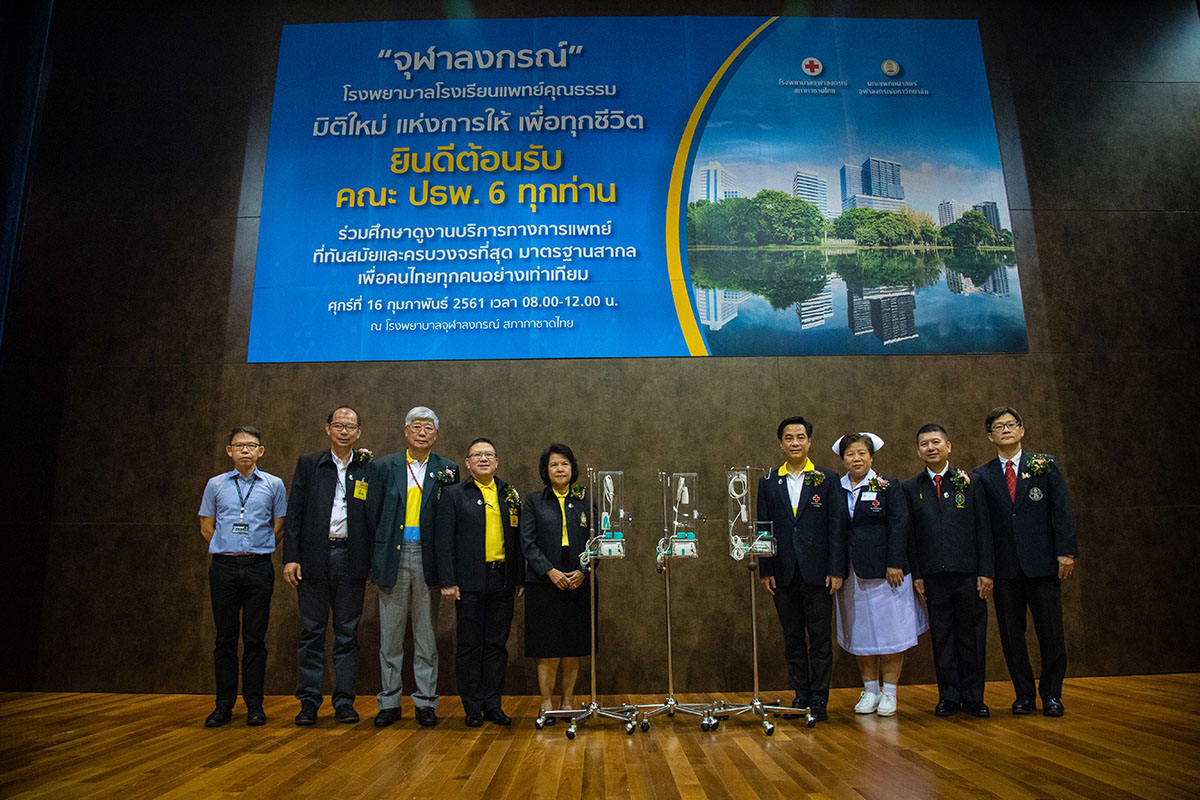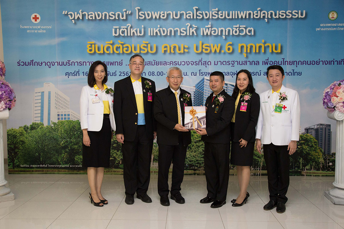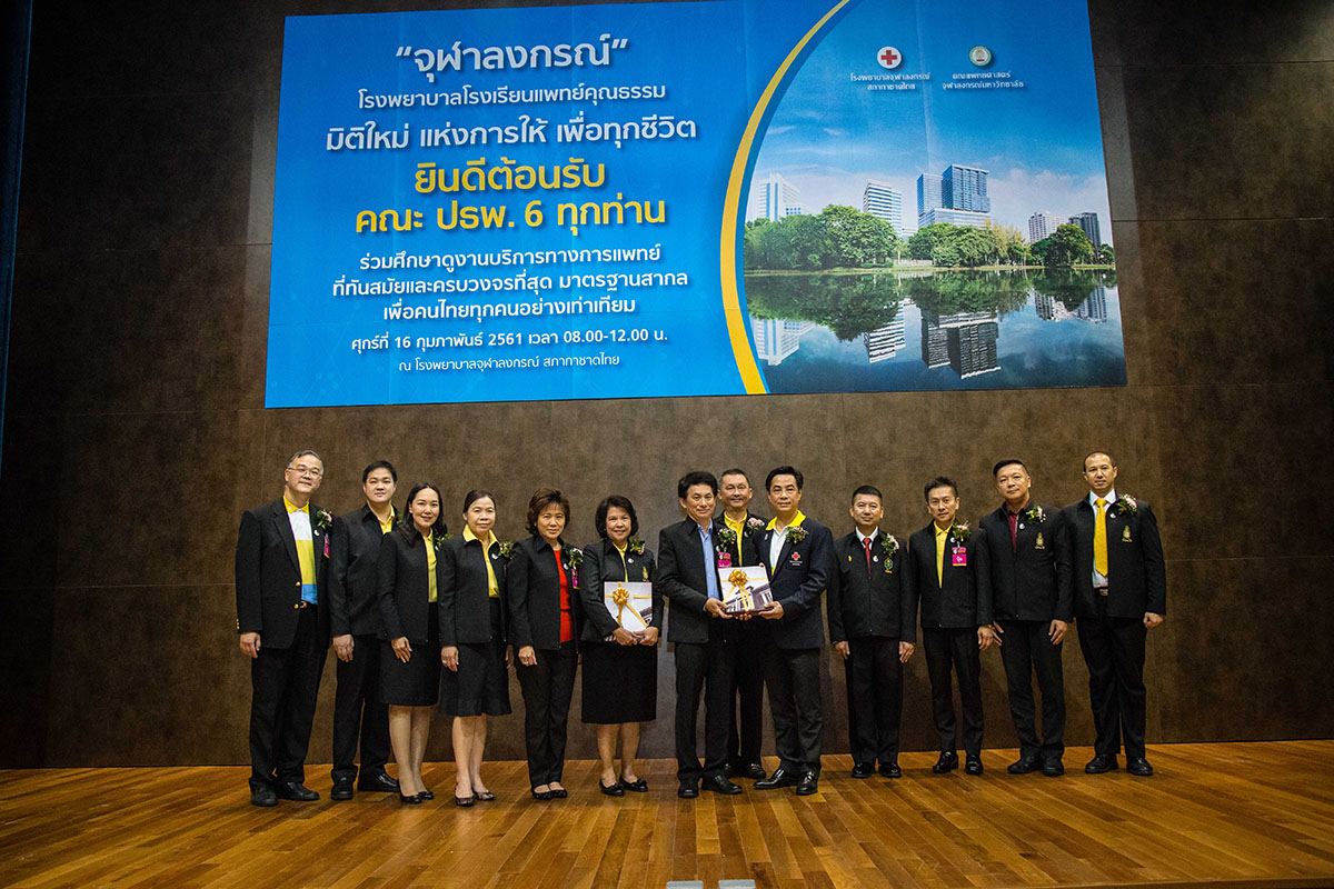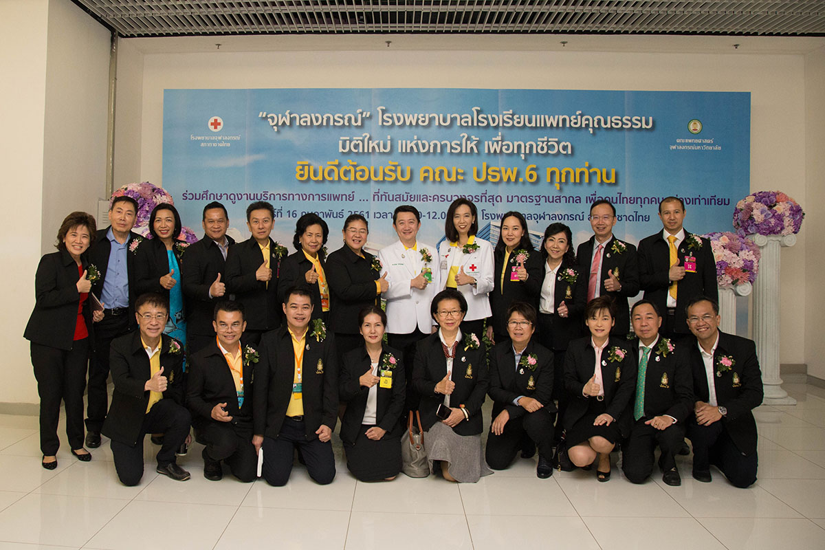 เมื่อวันที่ 16 กุมภาพันธ์ 2561 ศ.คลินิก นพ.อุดม คชินทร รัฐมนตรีช่วยว่าการกระทรวงศึกษาธิการ พล.ต.อิทธพร ธนะเจริญ ประธานหลักสูตรธรรมภิบาลทางการแพทย์สำหรับผู้บริหารระดับสูง  และ พล.ต. นพ.พีระพล ปกป้อง ประธานหลักสูตรประกาศนียบัตรธรรมาภิบาลทางการแพทย์สำหรับผู้บริหารระดับสูง (ปธพ.6) นำคณะผู้บริหารหลักสูตรธรรมภิบาลทางการแพทย์สำหรับผู้บริหารระดับสูง (ปธพ.6) ซึ่งจัดโดยแพทยสภา ร่วมกับสถาบันพระปกเกล้า จำนวน 140 คน เข้าศึกษาดูงานการบริการของหน่วยงานต่างๆ ภายในอาคารภูมิสิริมังคลานุสรณ์ และงานบริการผู้สูงอายุ อาคาร ส.ธ.โรงพยาบาลจุฬาลงกรณ์ สภากาชาดไทย โดยมี ศ.นพ.สุทธิพงศ์ วัชรสินธุ ผู้อำนวยการโรงพยาบาลจุฬาลงกรณ์ รศ.นพ.ฉันชาย สิทธิพันธุ์ (ปธพ.3) รองคณบดี ฝ่ายวางแผนและพัฒนา คณะแพทยศาสตร์ จุฬาฯ ผศ.(พิเศษ)นพ.สุรินทร์ อัศววิทูรทิพย์ (ปธพ. 6) ผู้ช่วยผู้อำนวยการฯ ด้านภาพลักษณ์องค์กร นางพรทิพย์ ควรคิด หัวหน้าพยาบาลโรงพยาบาลจุฬาลงกรณ์ พร้อมด้วยคณะผู้บริหาร แพทย์ พยาบาล และเจ้าหน้าที่ ให้การต้อนรับ ณ ห้องประชุม 1210 ชั้น 12 อาคารภูมิสิริมังคลานุสรณ์ โรงพยาบาลจุฬาลงกรณ์
