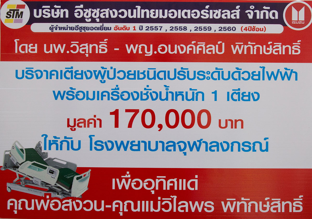 บริษัท อีซุซุสงวนไทยมอเตอร์เซลส์ จำกัด โดย นพ.วิสุทธิ์ พิทักษ์สิทธิ์ และ พญ.อนงค์ศิลป์ พิทักษ์สิทธิ์ บริจาคเตียงผู้ป่วยชนิดปรับระดับด้วยไฟฟ้าพร้อมเครื่องชั่งน้ำหนัก มูลค่า 170,000 บาท ให้โรงพยาบาลจุฬาลงกรณ์ สภากาชาดไทย โดยมี ศ.พญ.นิจศรี ชาญณรงค์ หัวหน้าศูนย์ความเป็นเลิศทางการแพทย์ด้านโรคหลอดเลือดสมองแบบครบวงจร โรงพยาบาลจุฬาลงกรณ์ รับมอบ เมื่อวันพุธที่ 25 กรกฎาคม 2561 ณ ศาลาทินทัต