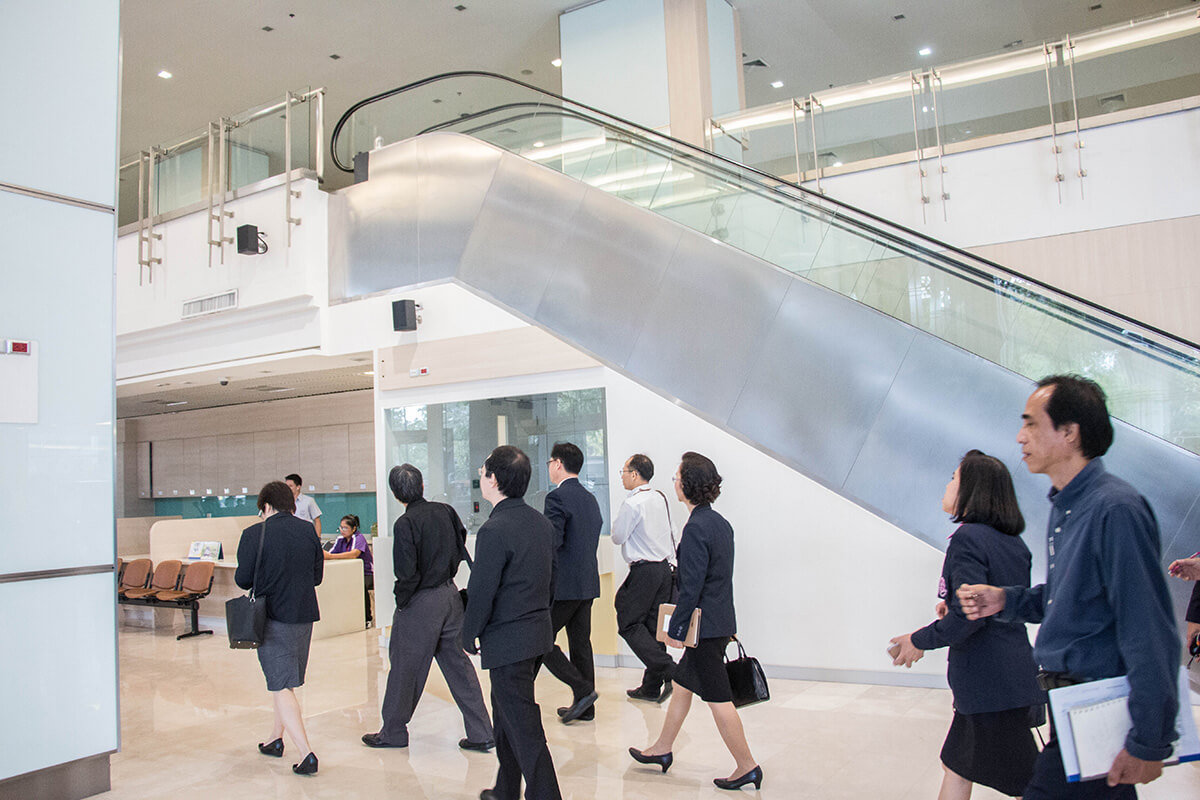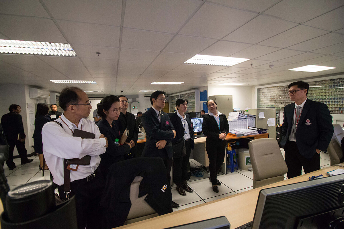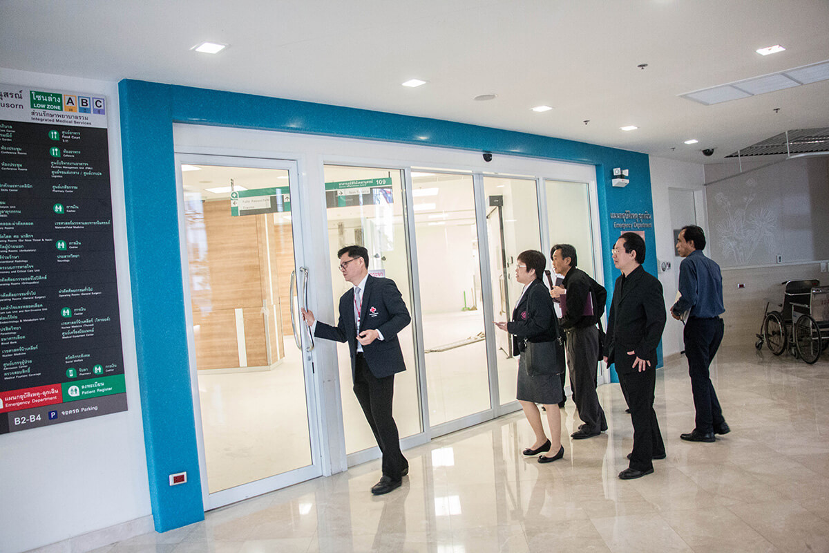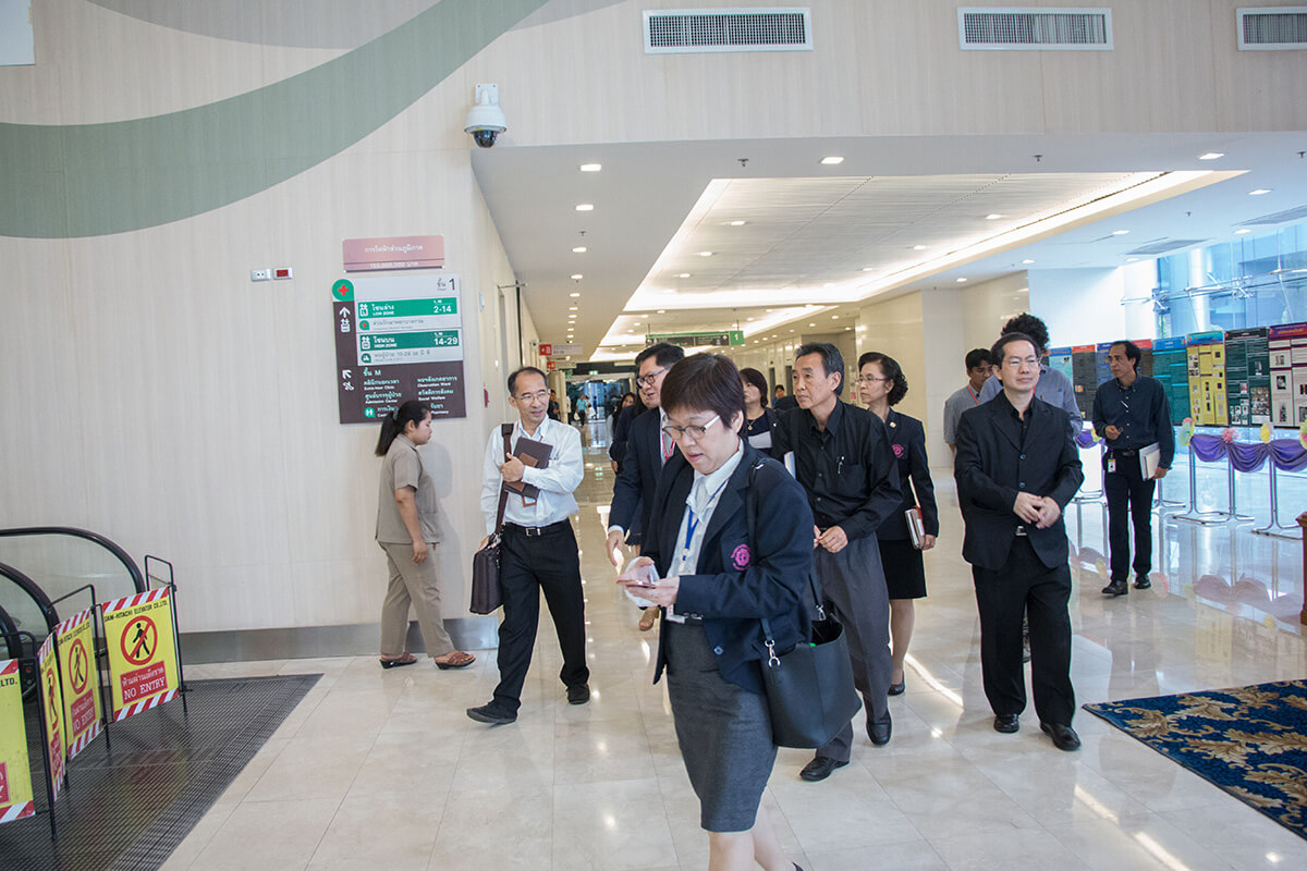ศ.นพ.รื่นเริง ลีลานุกรม รองผู้อำนวยการ โรงพยาบาลจุฬาลงกรณ์ ฝ่ายบริการ พร้อมด้วย อ.นพ.กวิรัช ตันติวงษ์ ผู้ช่วยผู้อำนวยการ โรงพยาบาลจุฬาลงกรณ์ ด้านความเสี่ยง ให้การต้อนรับ นพ.มานัส โพธาภรณ์ ผู้อำนวยการโรงพยาบาลราชวิถี และคณะศึกษาดูงานจาก โรงพยาบาลราชวิถี กรมการแพทย์ กระทรวงสาธารณสุข ในโอกาสเข้าเยี่ยมชม และ ศึกษาดูงานการบริหารการจัดการอาคารภูมิสิริมังคลานุสรณ์ โรงพยาบาลจุฬาลงกรณ์