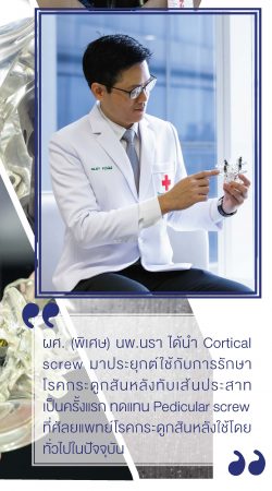 ขึ้นชื่อว่า “โรคกระดูกสันหลังทับเส้นประสาท” ผู้ป่วยหลายคนคงรู้สึกหมดหวังที่จะหายขาดและกลับมาใช้ชีวิตได้เป็นปกติภายในระยะเวลาสั้นๆ เพราะแม้จะมีการผ่าตัดที่ได้ผลดีอย่างยิ่ง แต่ก็ไม่อาจปฏิเสธได้ว่าการผ่าตัดย่อมทำให้ร่างกายผู้ป่วยบอบช้ำและเสียเลือดมาก อีกทั้งผู้ป่วยที่ร่างกายไม่แข็งแรงก็ไม่สามารถเข้ารับการรักษาด้วยวิธีนี้ได้ แต่ปัจจุบัน ฝ่ายออร์โธปิดิกส์ โรงพยาบาลจุฬาลงกรณ์ สภากาชาดไทย ประสบความสำเร็จก้าวหน้าไปอีกขั้นซึ่งเป็นครั้งแรกของประเทศไทยที่ศัลยแพทย์ผู้เชี่ยวชาญด้านโรคกระดูกสันหลังสามารถประยุกต์ใช้ “สกรูเหล็กชนิดใหม่” ผสมผสานกับ “เทคนิคใหม่” ทำให้การผ่าตัดเพื่อรักษาโรคกระดูกสันหลังทับเส้นประสาทกลายเป็นวิธีการรักษาที่มีประสิทธิผลมากขึ้น โดยไม่ต้องเปลี่ยนหมอนรองกระดูก ด้วยเทคนิคใหม่นี้จะทำให้ผู้ป่วยเจ็บน้อยลงและหายเร็วขึ้น อีกทั้งผู้สูงวัยก็สามารถเข้ารับการผ่าตัดได้ด้วย