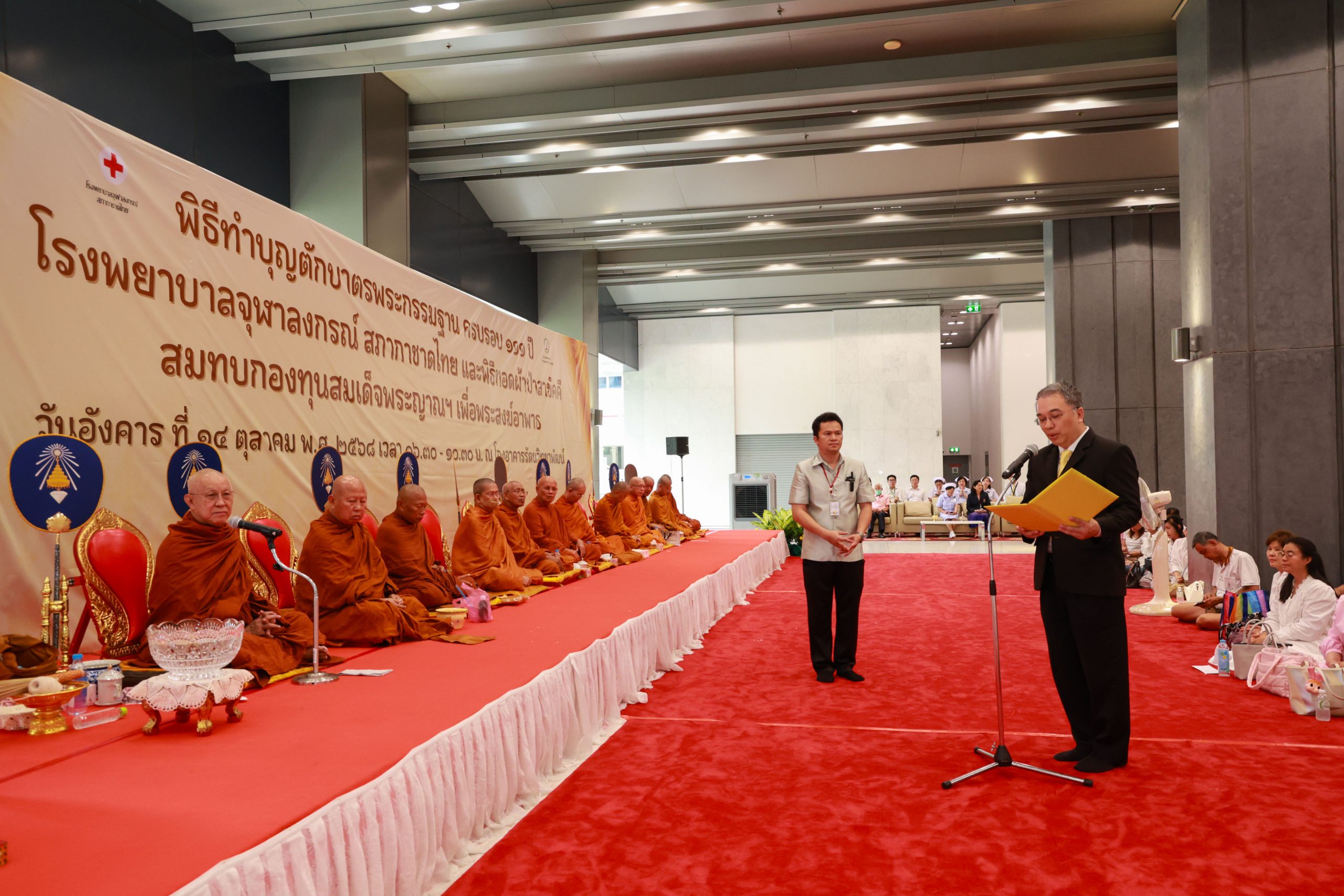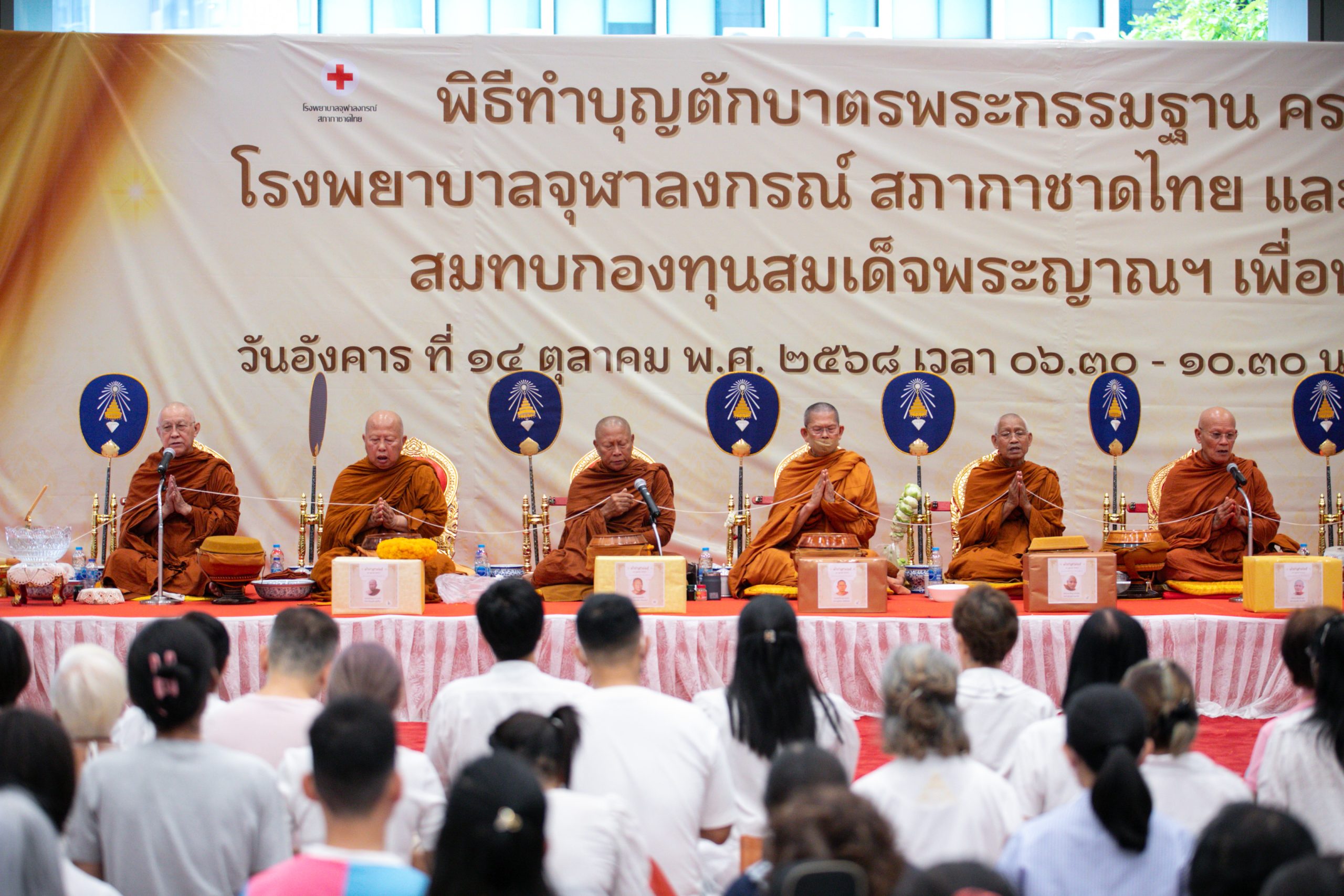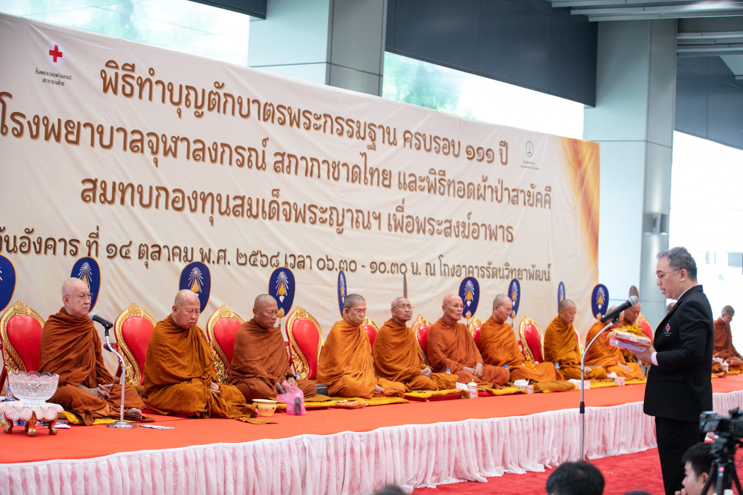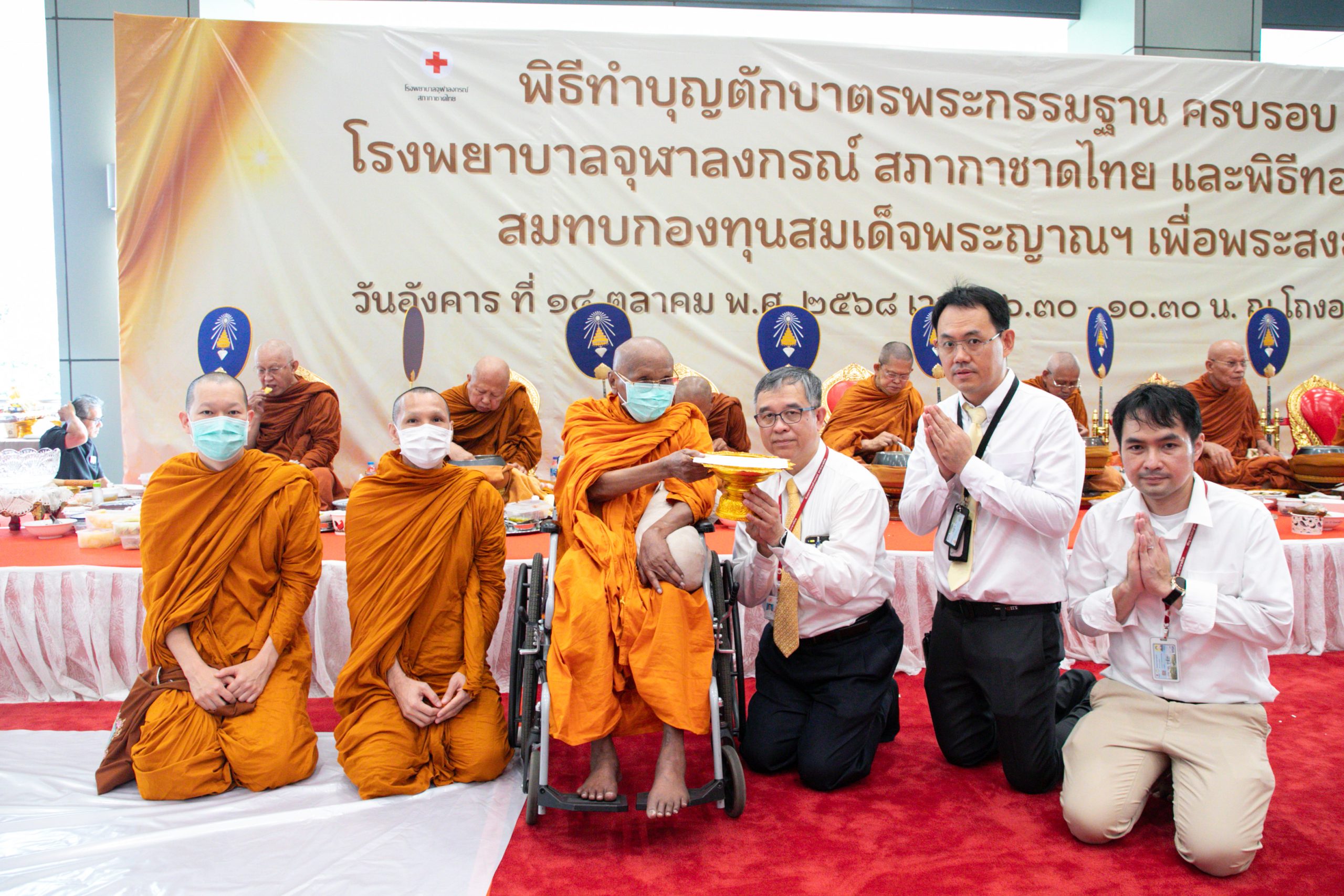 เมื่อวันที่ วันที่ 14 ตุลาคม 2568 โรงพยาบาลจุฬาลงกรณ์ สภากาชาดไทย และคณะแพทยศาสตร์ จุฬาลงกรณ์มหาวิทยาลัย จัดพิธีทำบุญตักบาตรพระกรรมฐาน ครบรอบ 111 ปี โรงพยาบาลจุฬาลงกรณ์ สภากาชาดไทย และพิธีทอดผ้าป่าสามัคคี สมทบกองทุนสมเด็จพระญาณฯ เพื่อพระสงฆ์อาพาธ โดยมี รศ.ดร.นพ.จิรุตม์ ศรีรัตนบัลล์ ผู้อำนวยการโรงพยาบาลจุฬาลงกรณ์ สภากาชาดไทย และคณบดี คณะแพทยศาสตร์ จุฬาลงกรณ์มหาวิทยาลัย เป็นประธานในพิธีทำบุญตักบาตรพระกรรมฐาน และ รศ.นพ.รัฐพลี ภาคอรรถ รองผู้อำนวยการฯ ฝ่ายสนับสนุนบริการ เป็นประธานในพิธีทอดผ้าป่าสามัคคี พร้อมด้วย คณะผู้บริหาร แพทย์ พยาบาล บุคลากร ตลอดจนผู้มีจิตศรัทธา ร่วมสมทบกองทุนสมเด็จพระญาณฯ ดูแลรักษาพยาบาลพระภิกษุสามเณรอาพาธ และผู้ป่วยสามัญของโรงพยาบาล พร้อมทั้งจัดหาเครื่องมือทางการแพทย์ โดยมี พระราชวชิรธรรมาจารย์ (หลวงพ่อสุธรรม สุธัมโม) วัดป่าบ้านตาด จ.อุดรธานี เป็นประธานสงฆ์พิจารณาผ้าป่าฯ ในครั้งนี้ ณ บริเวณโถงอาคารรัตนวิทยาพัฒน์