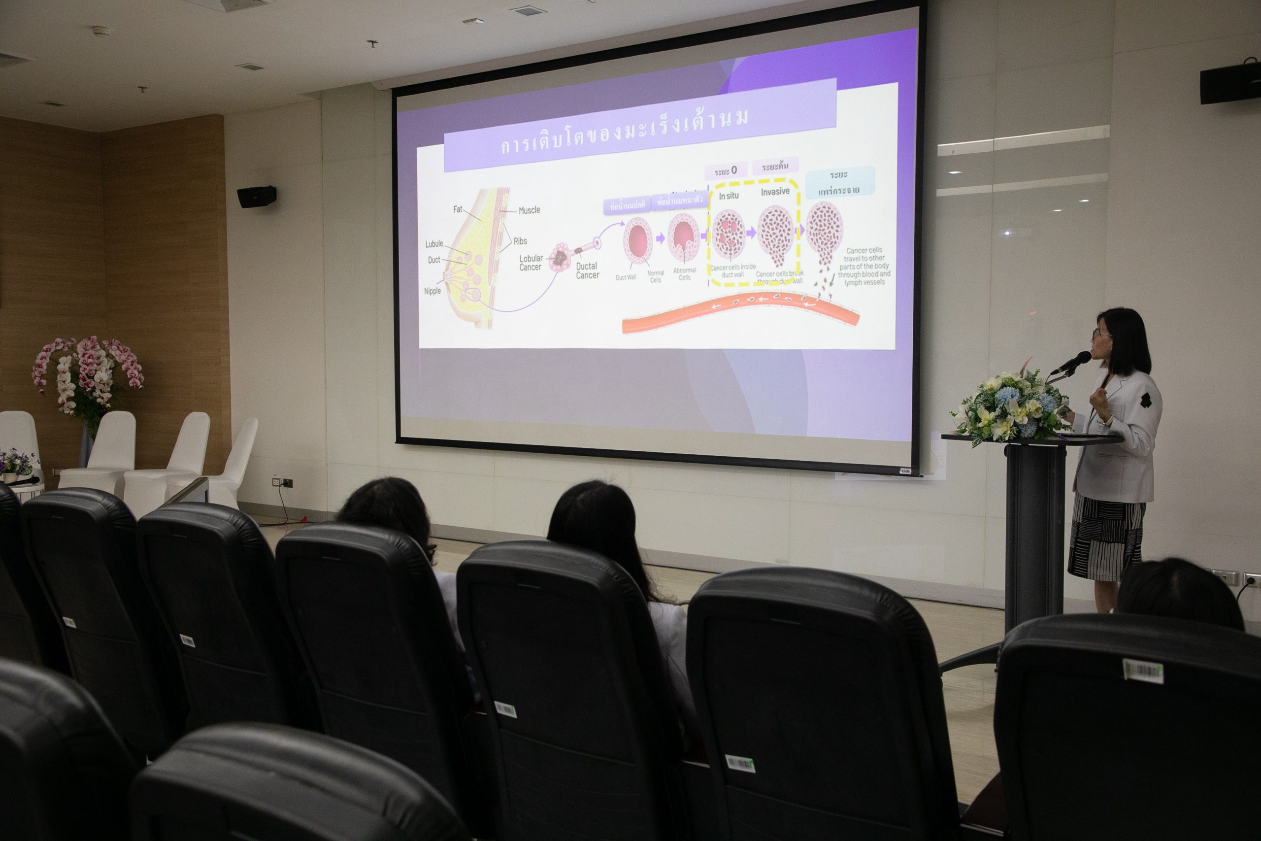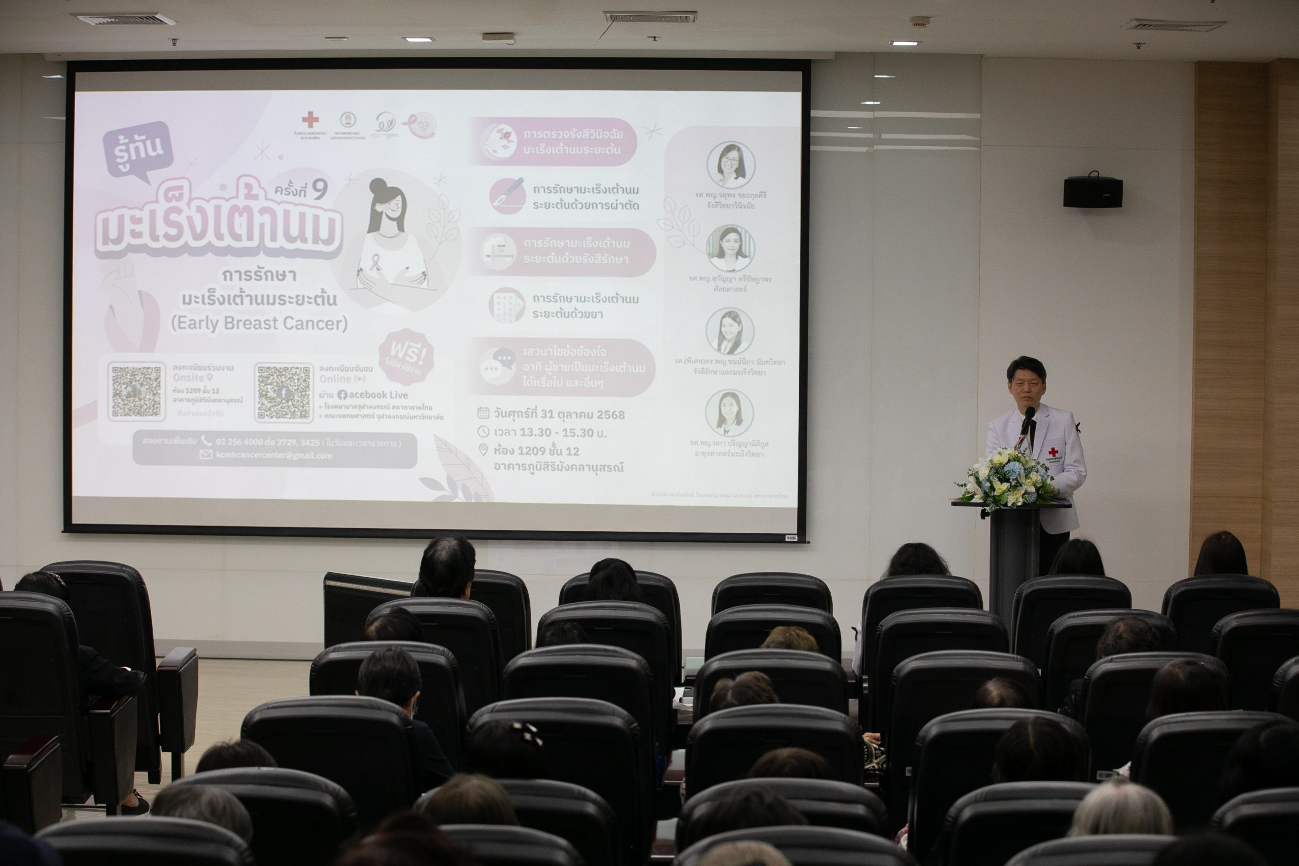 เมื่อวันที่ 31 ตุลาคม 2568 ศูนย์ความเป็นเลิศทางการแพทย์โรคมะเร็งครบวงจร โรงพยาบาลจุฬาลงกรณ์ สภากาชาดไทย และคณะแพทยศาสตร์ จุฬาลงกรณ์มหาวิทยาลัย ร่วมยืนสงบนิ่งเพื่อแสดงความอาลัยและน้อมรำลึกในพระมหากรุณาธิคุณสมเด็จพระนางเจ้าสิริกิติ์ พระบรมราชินีนาถ พระบรมราชชนนีพันปีหลวง สภานายิกาสภากาชาดไทย ก่อนเริ่มพิธีเปิดงานเสวนาให้ความรู้แด่ประชาชนครั้งที่ 9 ภายใต้หัวข้อ “การรักษามะเร็งเต้านมระยะต้น” (Early Breast Cancer) เกี่ยวกับการตรวจวินิจฉัยและการรักษามะเร็งเต้านมระยะต้นจากทีมแพทย์ผู้เชี่ยวชาญ ซึ่งกิจกรรมในครั้งนี้มี ผศ.นพ.สืบพงศ์ ธนสารวิมล หัวหน้าศูนย์ความเป็นเลิศทางการแพทย์ โรคมะเร็งครบวงจรฯ เป็นประธานเปิดงานเสวนา ณ ห้อง 1209 ชั้น 12 อาคารภูมิสิริมังคลานุสรณ์