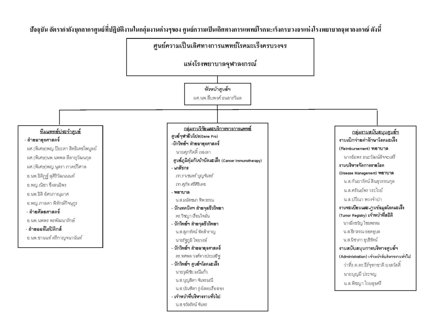 ศูนย์ความเป็นเลิศทางการแพทย์ โรคมะเร็งครบวงจร แห่งโรงพยาบาลจุฬาลงกรณ์ ได้รับความร่วมมือจากบุคลากรฝ่ายต่าง ๆ ร่วมพัฒนาการดูแลรักษาผู้ป่วยโรคมะเร็งอย่างครบวงจร ดังนี้