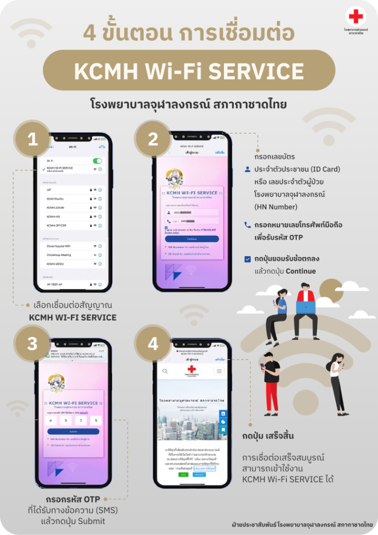 ริการสัญญาณอินเตอร์เน็ตภายในโรงพยาบาลจุฬาลงกรณ์ KCMH Wi-Fi SERVICE เป็นบริการที่อำนวยความสะดวกให้ผู้ใช้บริการโรงพยาบาลฯ และบุคลากรทางการแพทย์ ได้เชื่อมต่อสัญญาณอินเตอร์เน็ตโดยไม่เสียค่าใช้จ่าย สามารถใช้บริการได้ 8 ชั่วโมง