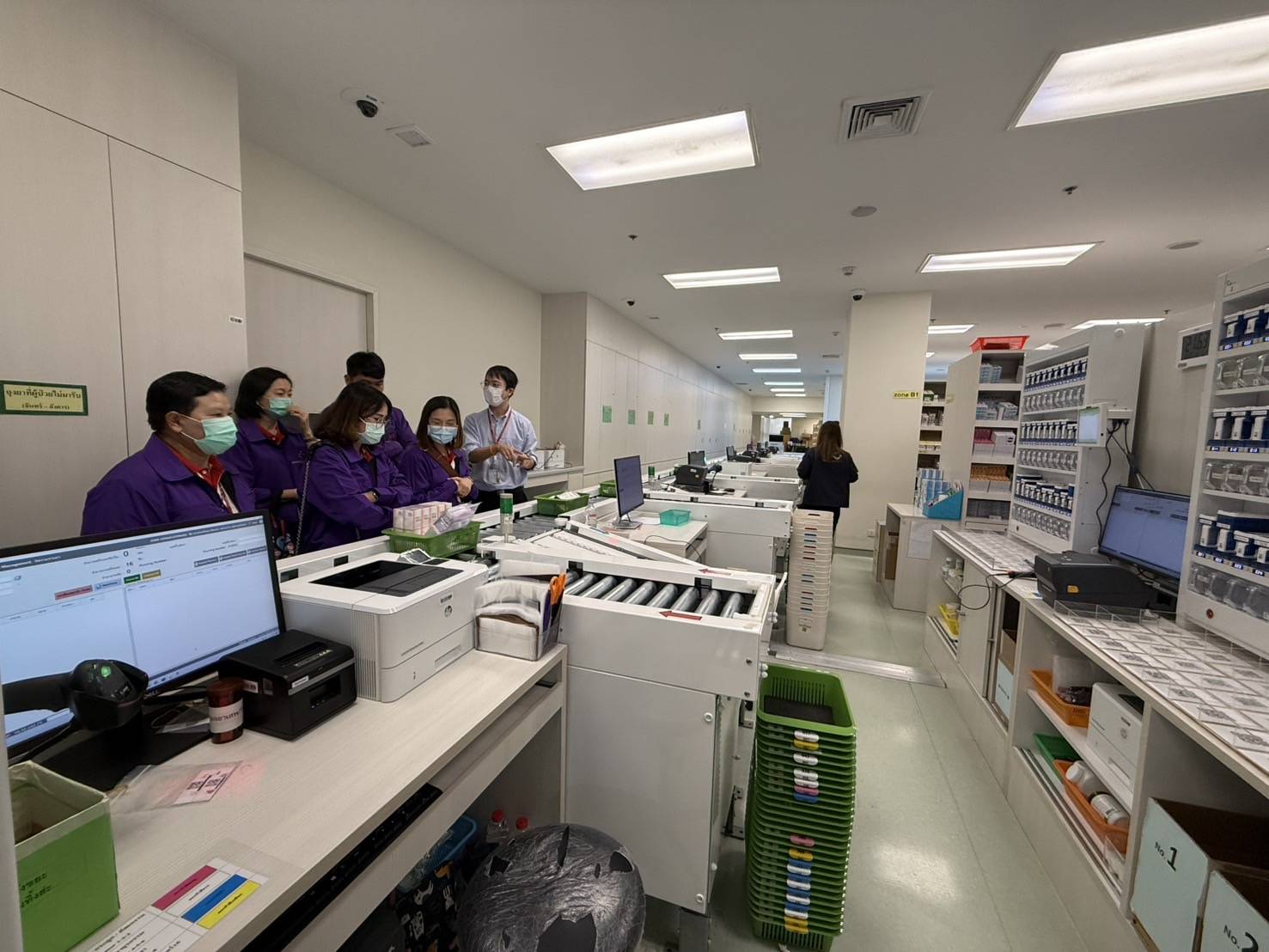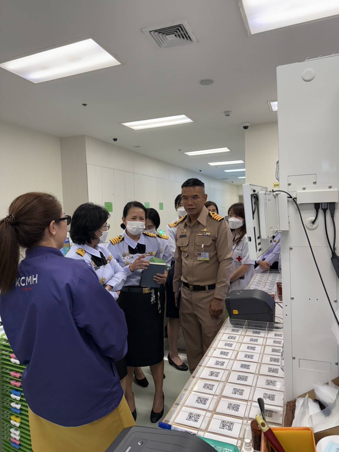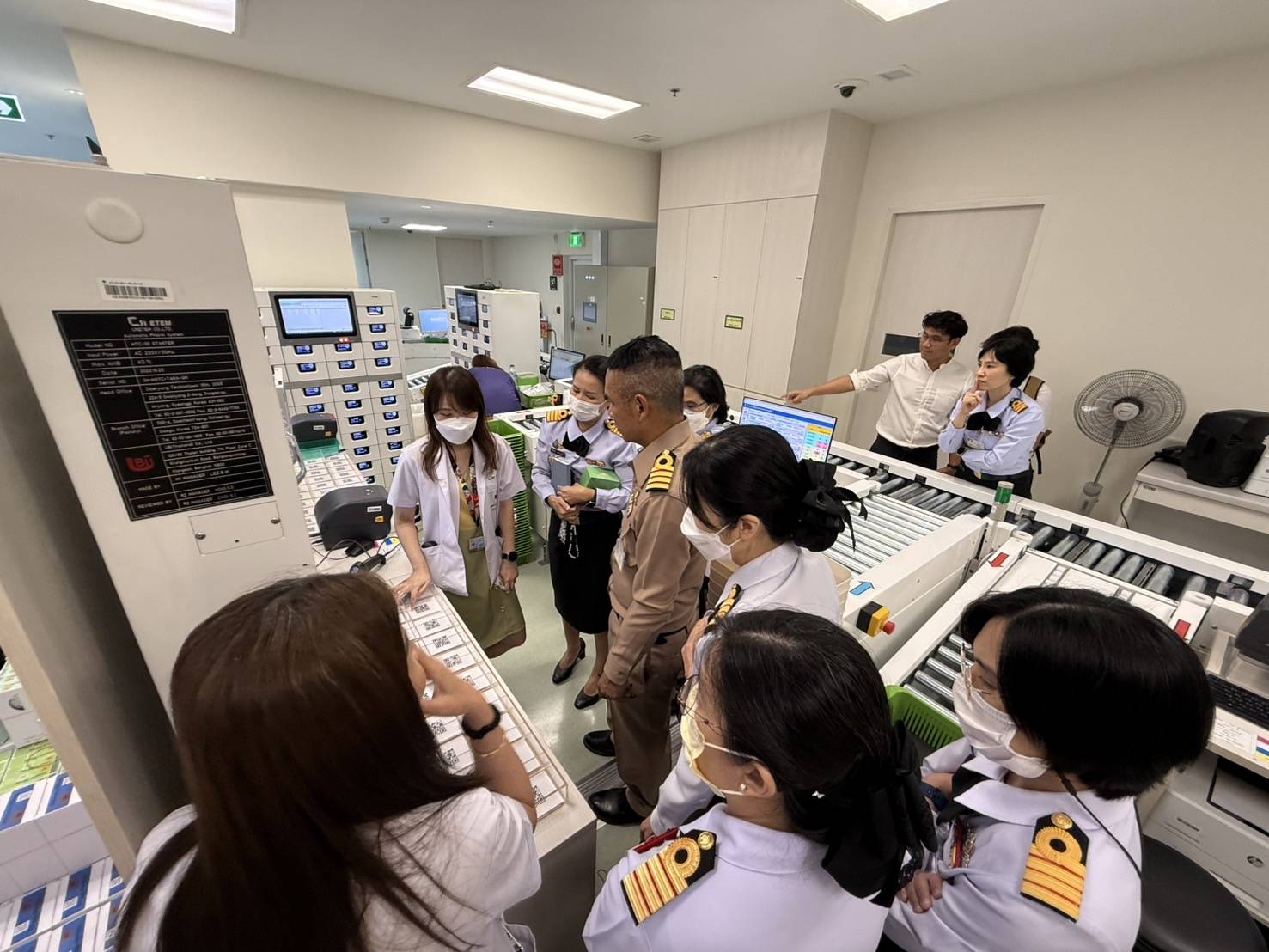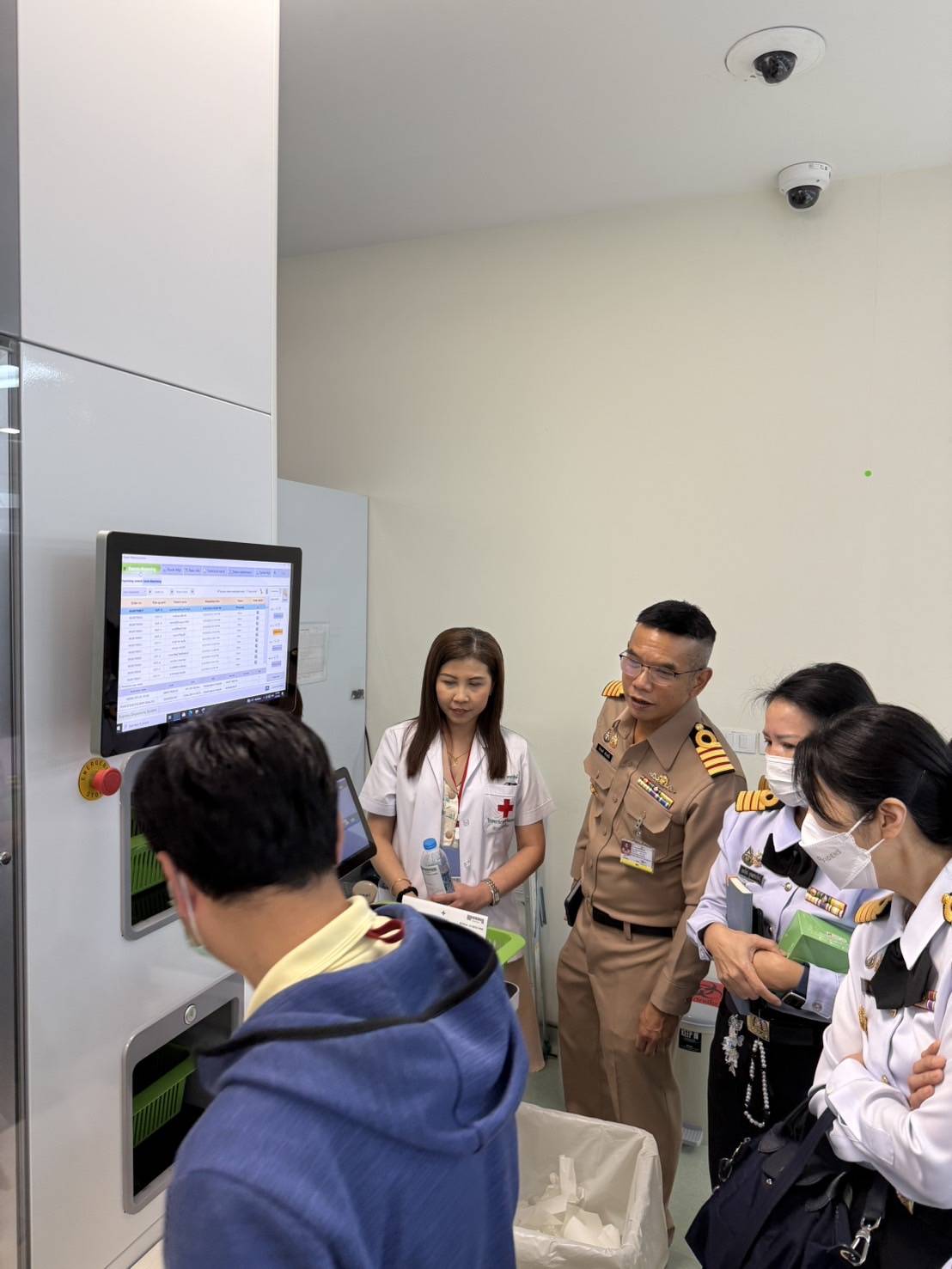 เมื่อวันที่ 20 และ 23 มิถุนายน 2568 โรงพยาบาลสมเด็จพระบรมราชเทวี ณ ศรีราชา และ โรงพยาบาลสมเด็จพระปิ่นเกล้า กรมแพทย์ทหารเรือ ศึกษาดูงานระบบจัดยาอัตโนมัติ (Pharmacy Dispensing Robot) ของห้องจ่ายยาผู้ป่วยนอก อาคารจักรีทศมรามาธิบดินทร์ ชั้น 2 โรงพยาบาลจุฬาลงกรณ์ สภากาชาดไทย โดยมี ภญ.วรรณี อิทธิวัฒนกุล ผู้ช่วยผู้อำนวยการฯ ด้านยา อาหารและเวชภัณฑ์ ภญ.พวงเพ็ญ ฤทธีวีรกูล หัวหน้ากลุ่มงานเภสัชกรรมพร้อมด้วยทีมเภสัชกร ให้การต้อนรับ และพาเยี่ยมชมการให้บริการของห้องจ่ายยาผู้ป่วยนอก เพื่อแลกเปลี่ยนประสบการณ์เรียนรู้ร่วมกัน ในการพัฒนาระบบบริการจ่ายยาผู้ป่วยนอก ให้มีความรวดเร็ว ปลอดภัย และทันสมัยมากยิ่งขึ้น สอดคล้องกับทิศทางการนำเทคโนโลยีมาช่วยในการพัฒนาคุณภาพระบบยาของโรงพยาบาลอย่างต่อเนื่องต่อไป