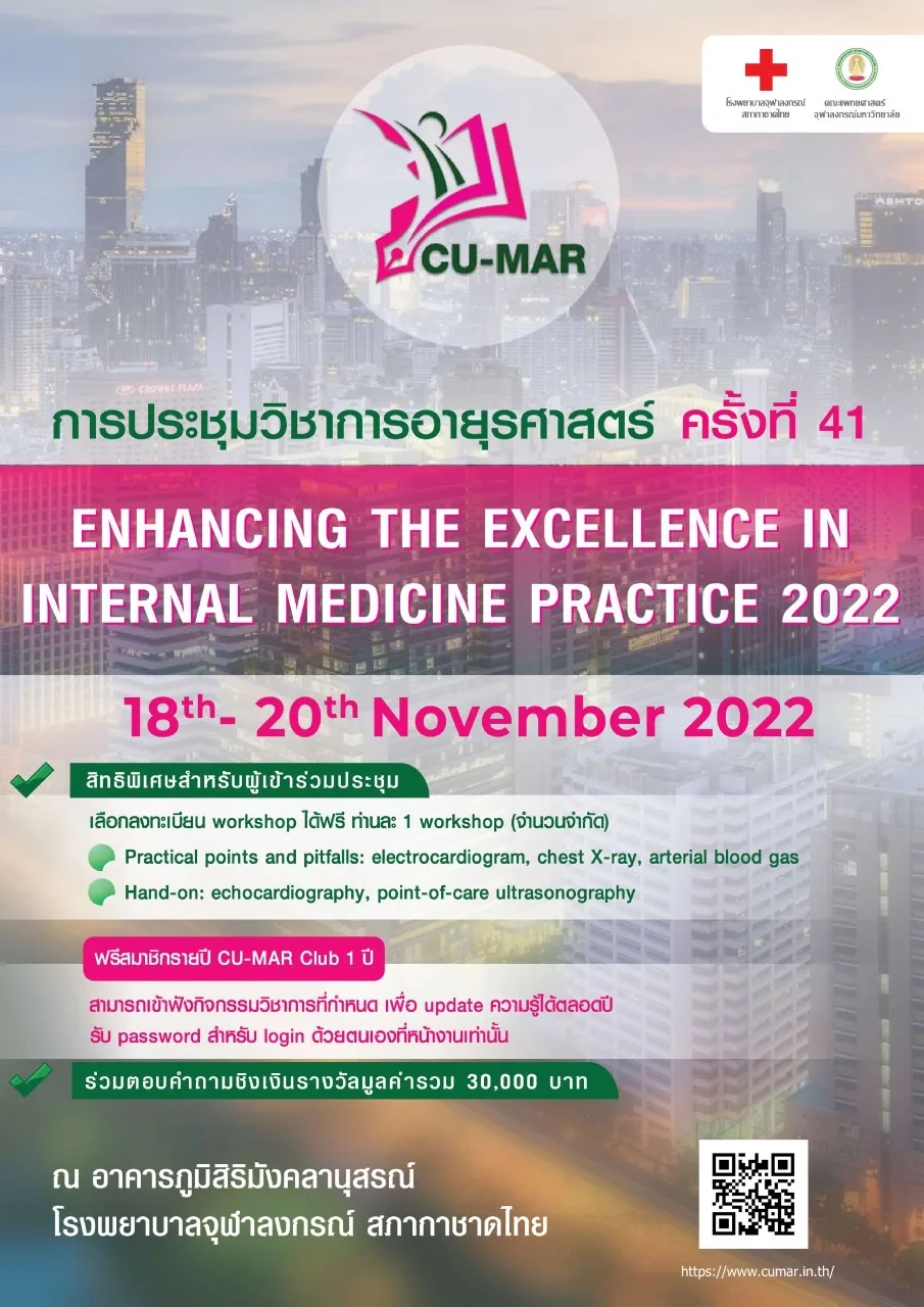 📣ฝ่ายอายุรศาสตร์ โรงพยาบาลจุฬาลงกรณ์ จัดประชุมวิชาการอายุรศาสตร์ระยะสั้นประจำปี ครั้งที่ 41 CU-MAR 2022 เรื่อง “Enhancing the Excellence in Internal Medicine Practice 2022”