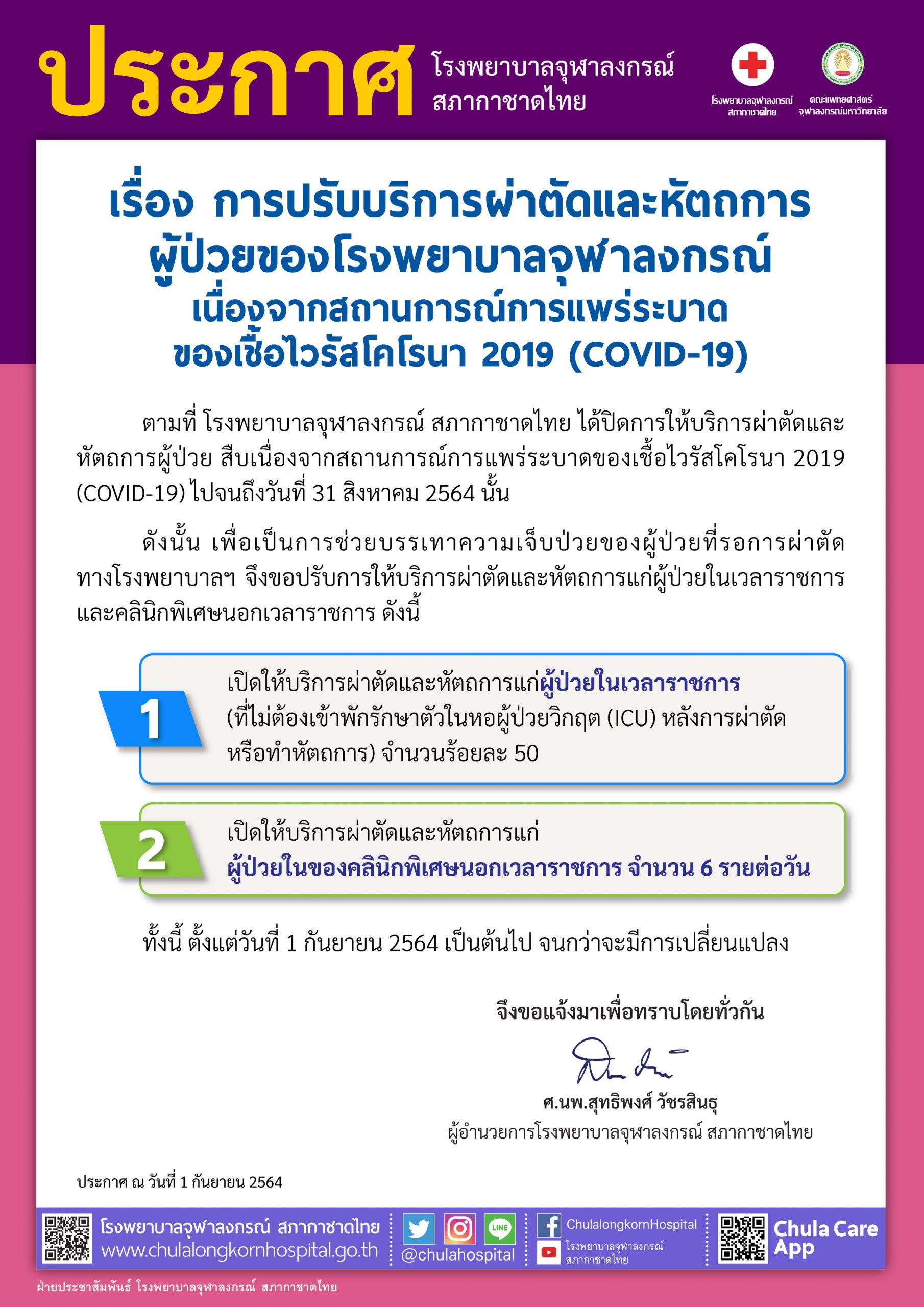 การปรับบริการผ่าตัดและหัตถการ ผู้ป่วยของโรงพยาบาลจุฬาลงกรณ์ เนื่องจากสถานการณ์การแพร่ระบาด ของเชื้อไวรัสโคโรนา 2019 (COVID-19)
