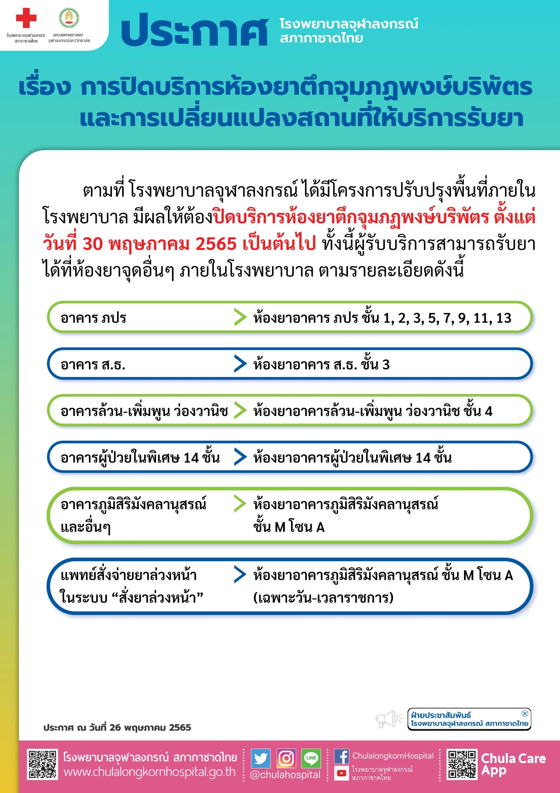 การปิดบริการห้องยาตึกจุมภฏพงษ์บริพัตร และการเปลี่ยนแปลงสถานที่ให้บริการรับยา