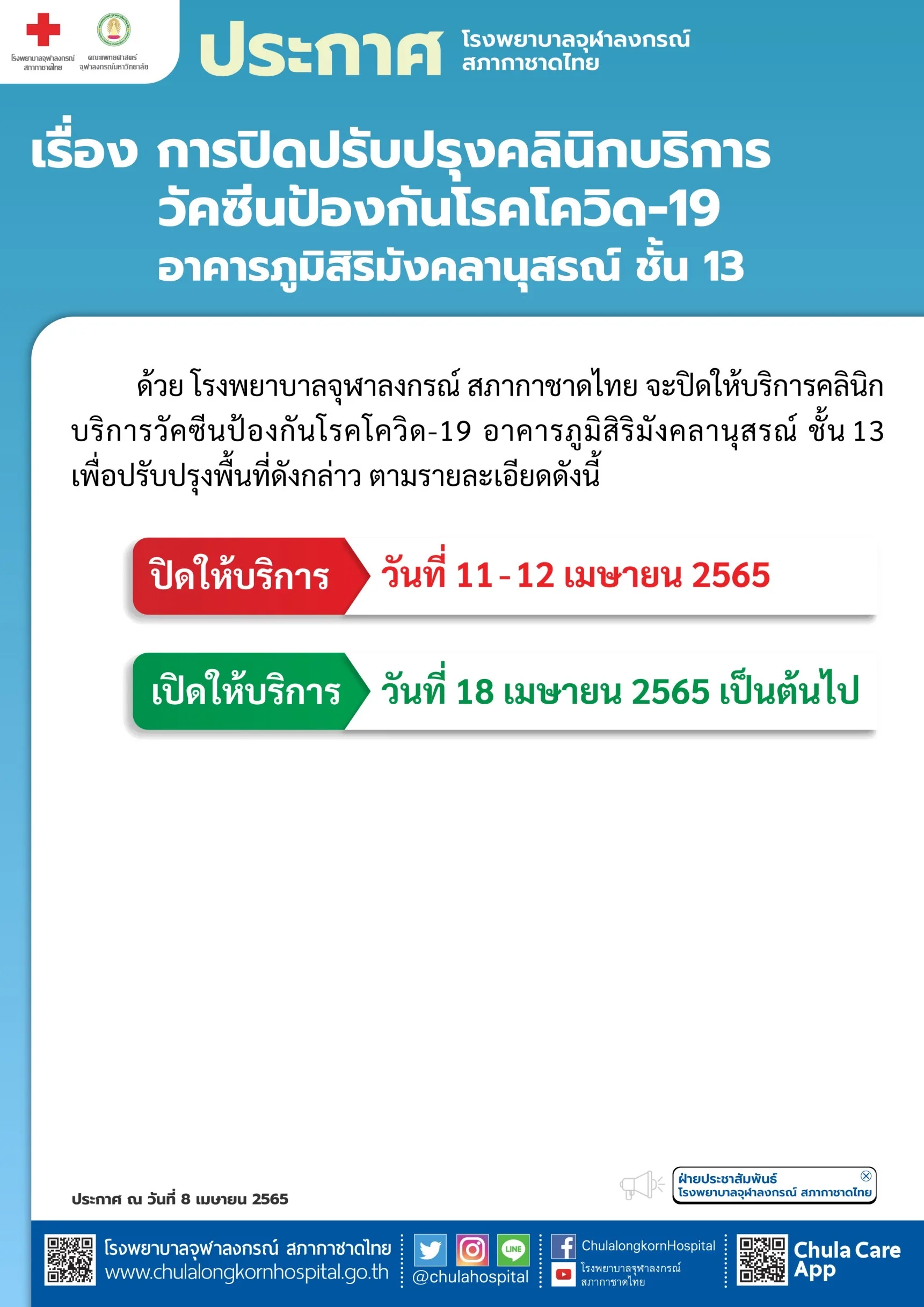 การปิดปรับปรุงคลินิกบริการ วัคซีนป้องกันโรคโควิด-19 อาคารภูมิสิริมังคลานุสรณ์ ชั้น 13