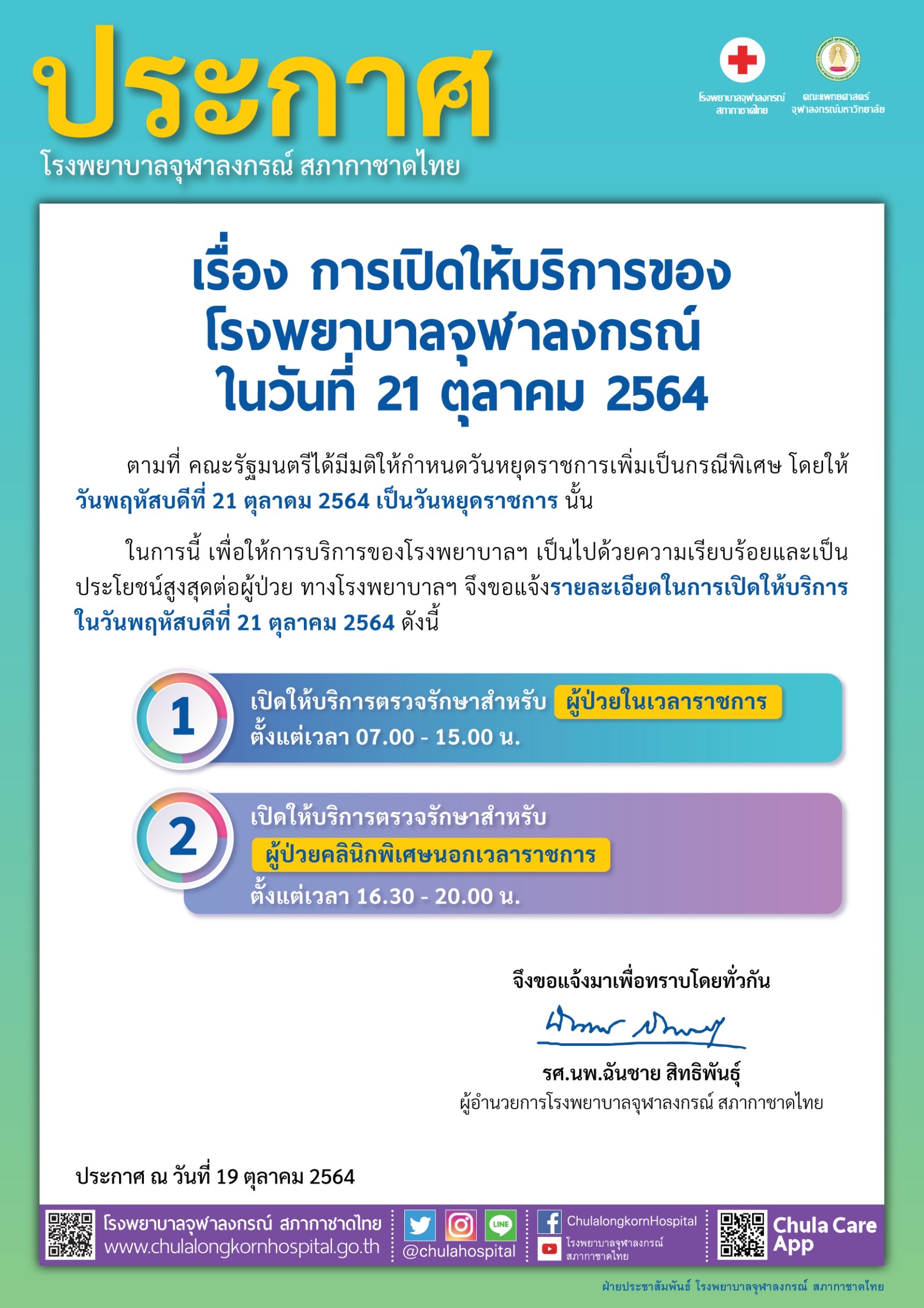 การเปิดให้บริการของ โรงพยาบาลจุฬาลงกรณ์ ในวันที่ 21 ตุลาคม 2564