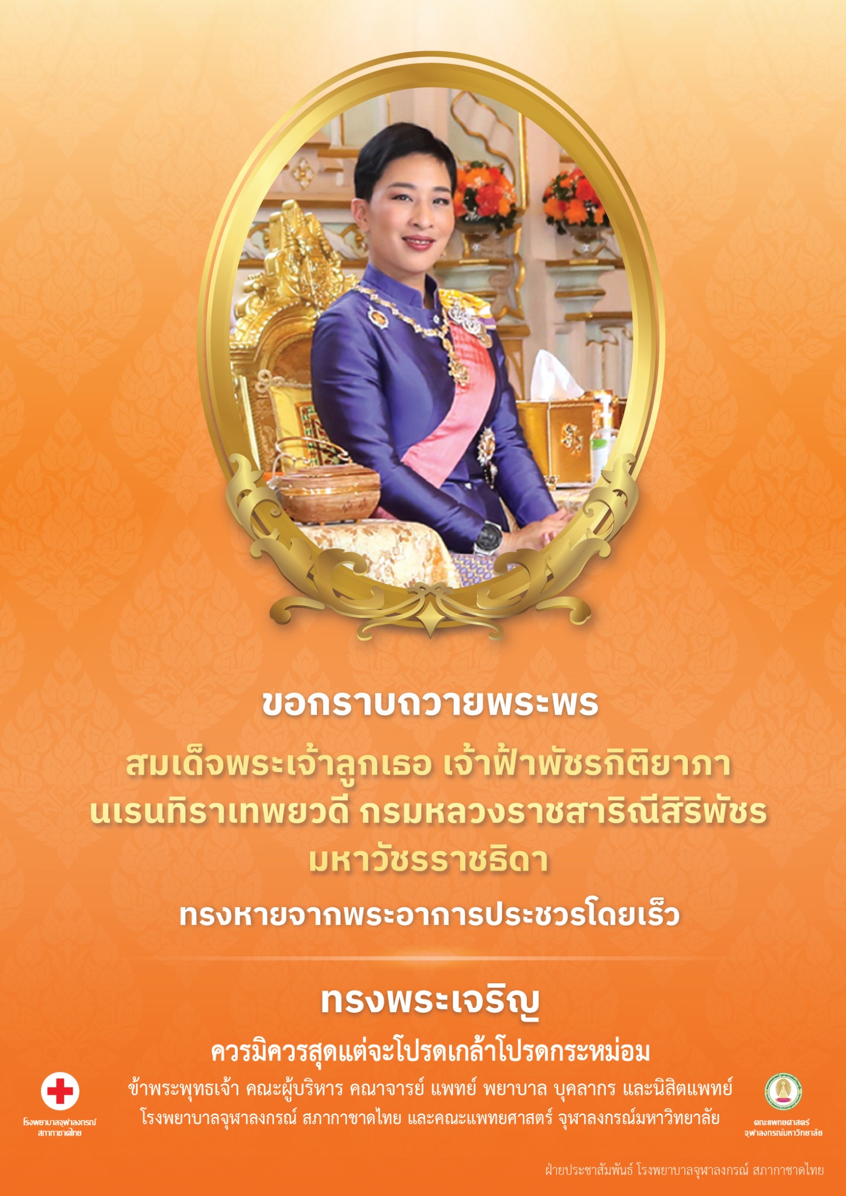 ขอกราบถวายพระพรสมเด็จพระเจ้าลูกเธอ เจ้าฟ้าพัชรกิติยาภา นเรนทิราเทพยวดี กรมหลวงราชสาริณีสิริพัชร มหาวัชรราชธิดา ทรงหายจากพระอาการประชวรโดยเร็ว