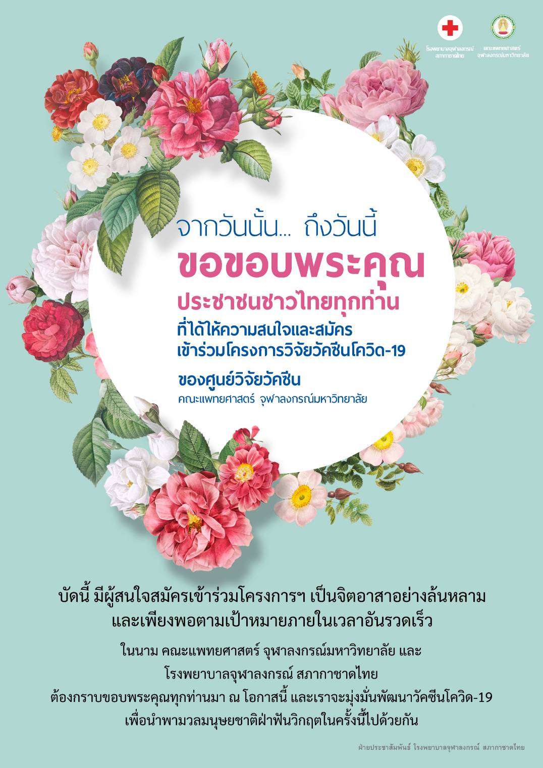 ขอขอบพระคุณ ประชาชนชาวไทยทุกท่าน ที่ได้ให้ความสนใจและสมัคร เข้าร่วมโครงการวิจัยวัคซีนโควิด-19