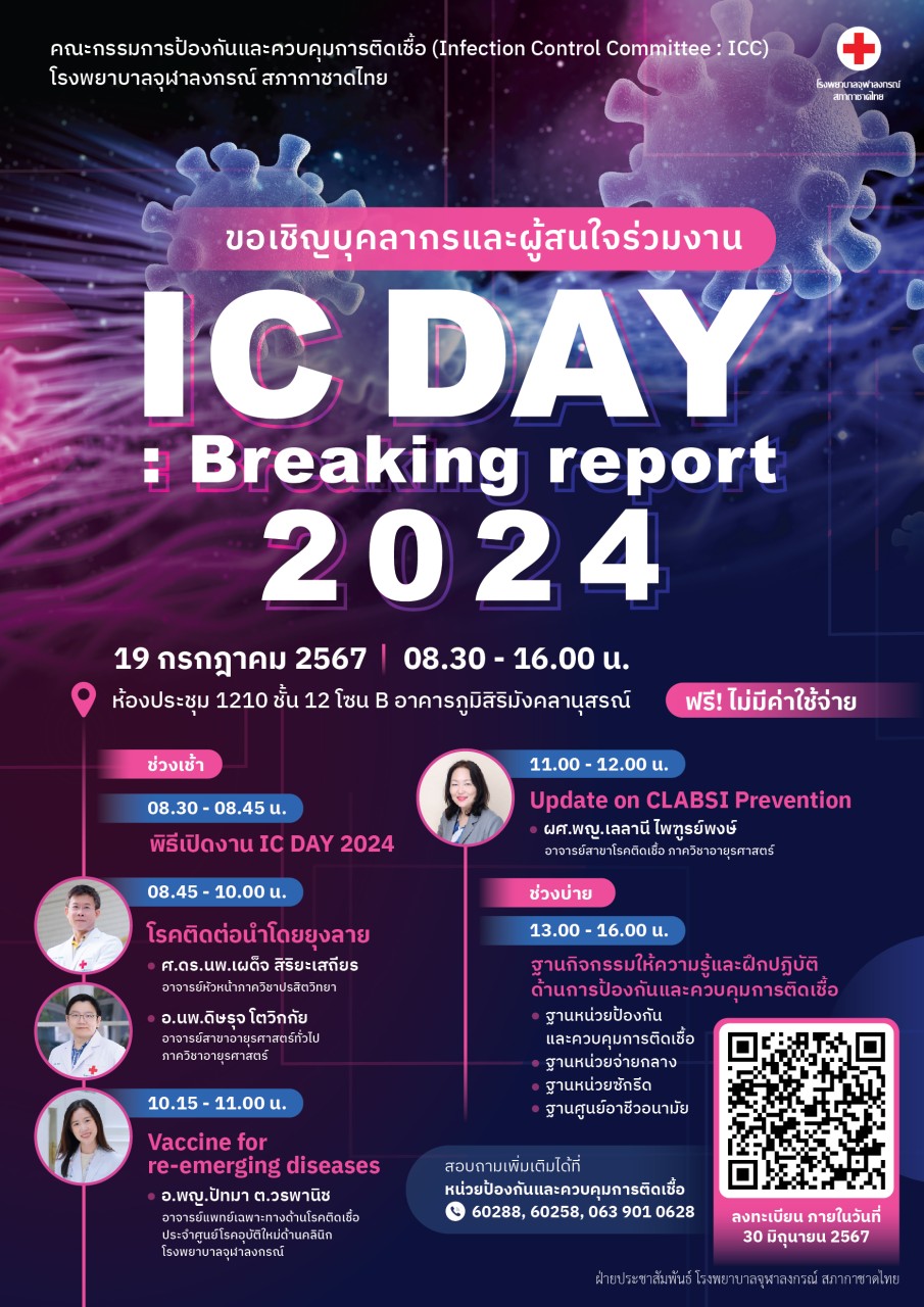 📣คณะกรรมการป้องกันและควบคุมการติดเชื้อ โรงพยาบาลจุฬาลงกรณ์ สภากาชาดไทย ขอเชิญบุคลากรและผู้สนใจร่วมงาน IC DAY : Breaking report 2024