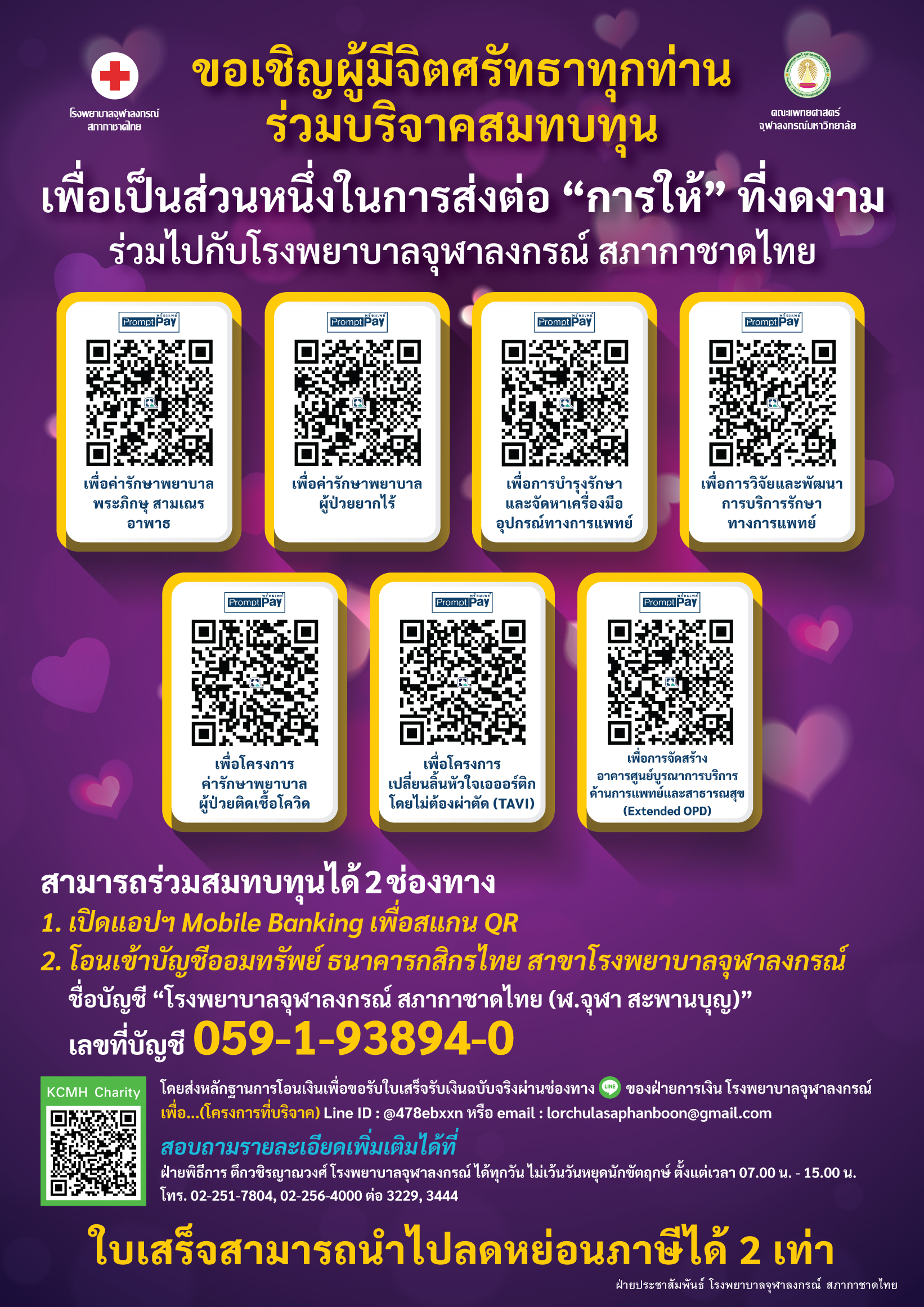 ขอเชิญผู้มีจิตศรัทธาทุกท่าน โรงพยาบาลจูพาลงกรณ์ คณะแพทยตาสตร์ สุทากาชาดไทย จุฬาลงกรณ์มหาวิทยาลัย เพื่อเป็นส่วนหนึ่งในการส่งต่อ “การให้” ที่งดงาม ร่วมไปกับโรงพยาบาลจุฬาลงกรณ์ สภากาชาดไทย