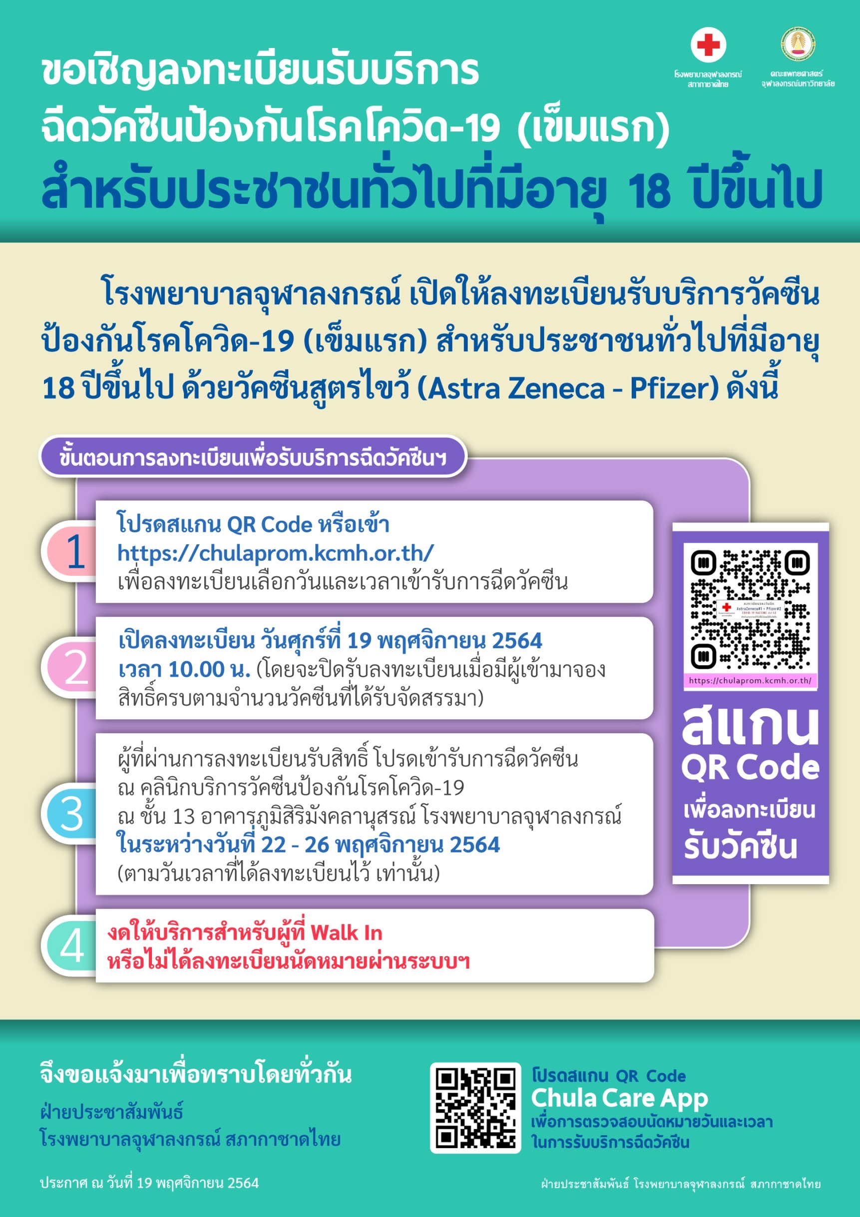 ขอเชิญลงทะเบียนรับบริการ ฉีดวัคซีนป้องกันโรคโควิด-19 (เข็มแรก) สำหรับประชาชนทั่วไปที่มีอายุ 18 ปีขึ้นไป