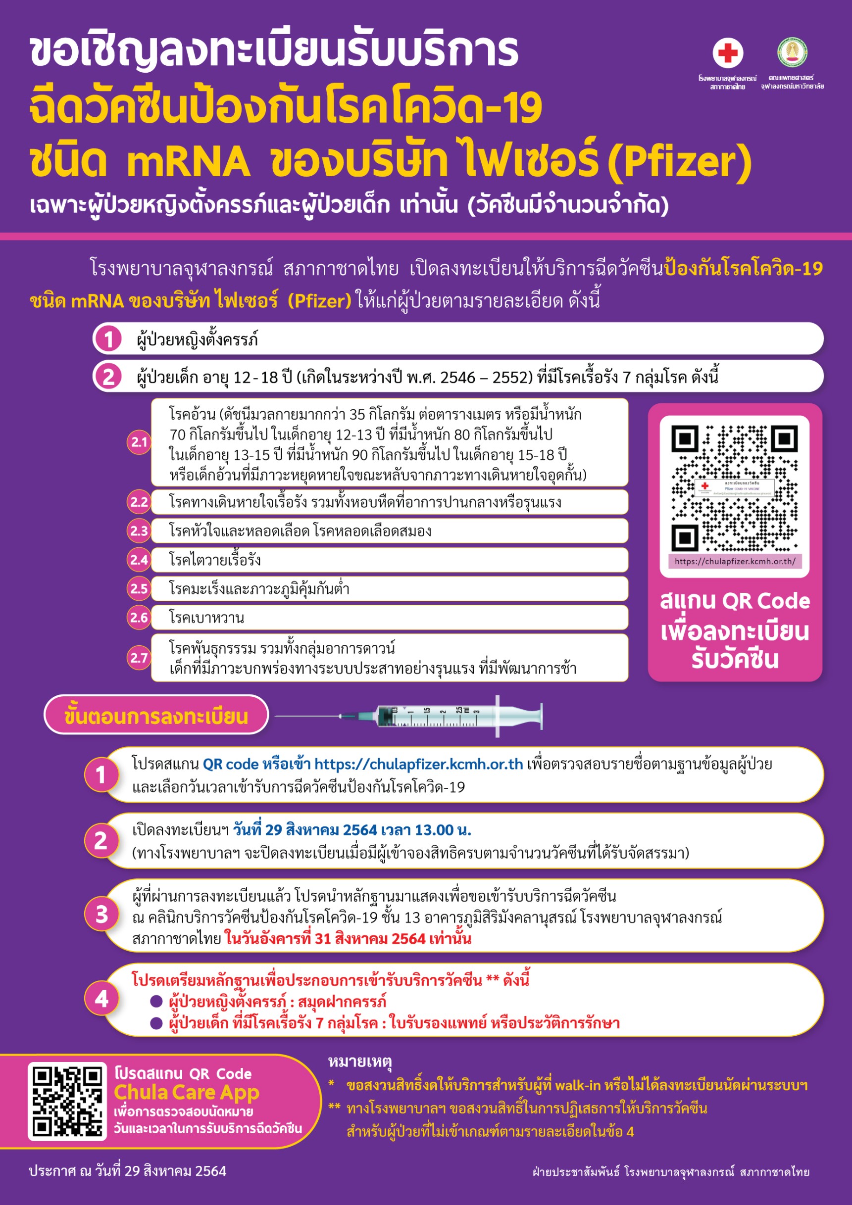 โรงพยาบาลจุฬาลงกรณ์ สภากาชาดไทย เปิดลงทะเบียนให้บริการฉีดวัคนป้องกันโรคโควิด-19 ชนิด mRNA ของบริษัท ไฟเซอร์ (Pfizer) ให้แก่ผู้ป่วยตามรายละเอียด ดังนี้