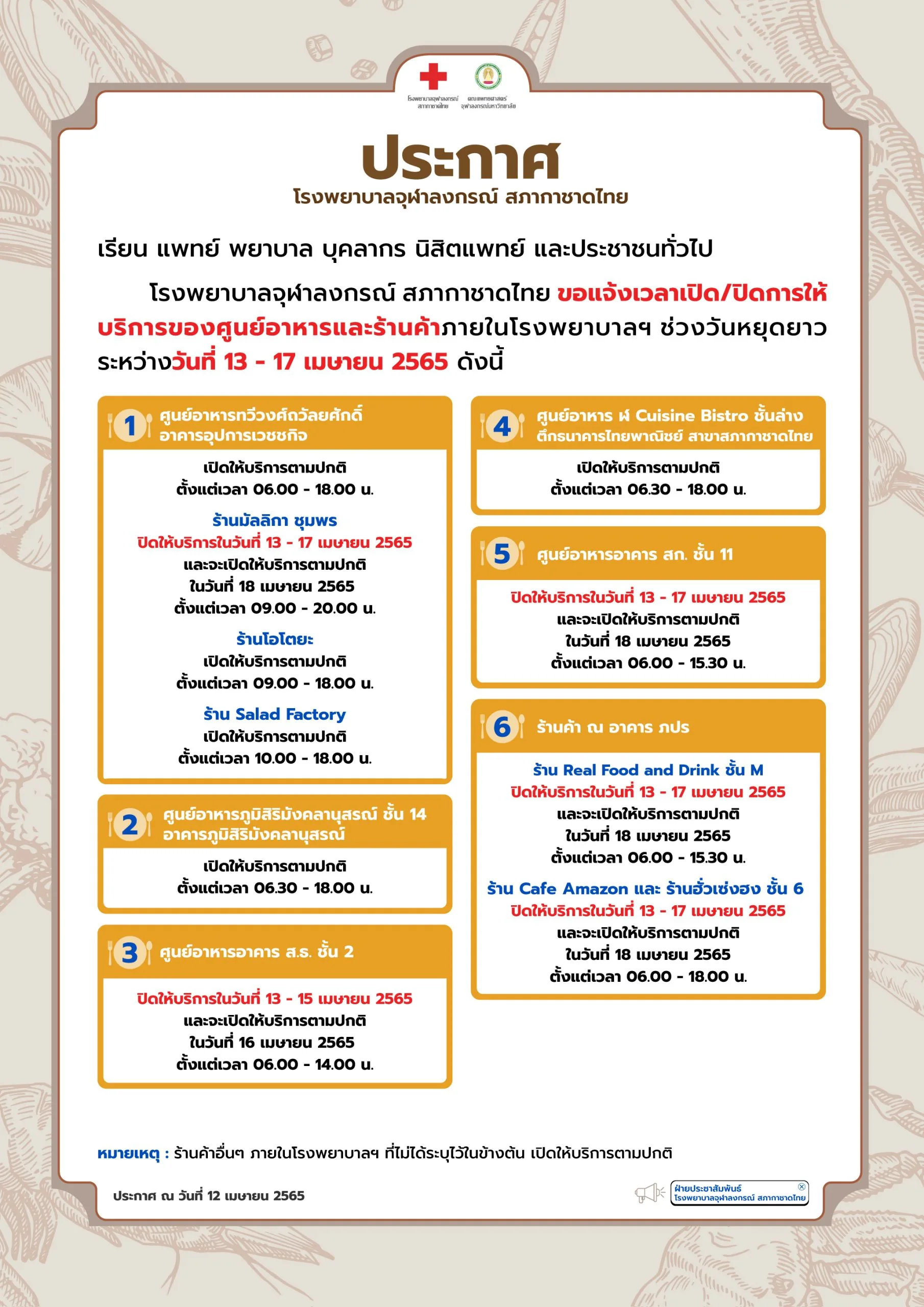 ขอแจ้งเวลาเปิด/ปิดการให้บริการของศูนย์อาหารและร้านค้าภายในโรงพยาบาลฯ ช่วงวันหยุดยาวระหว่างวันที่ 13 – 17 เมษายน 2565
