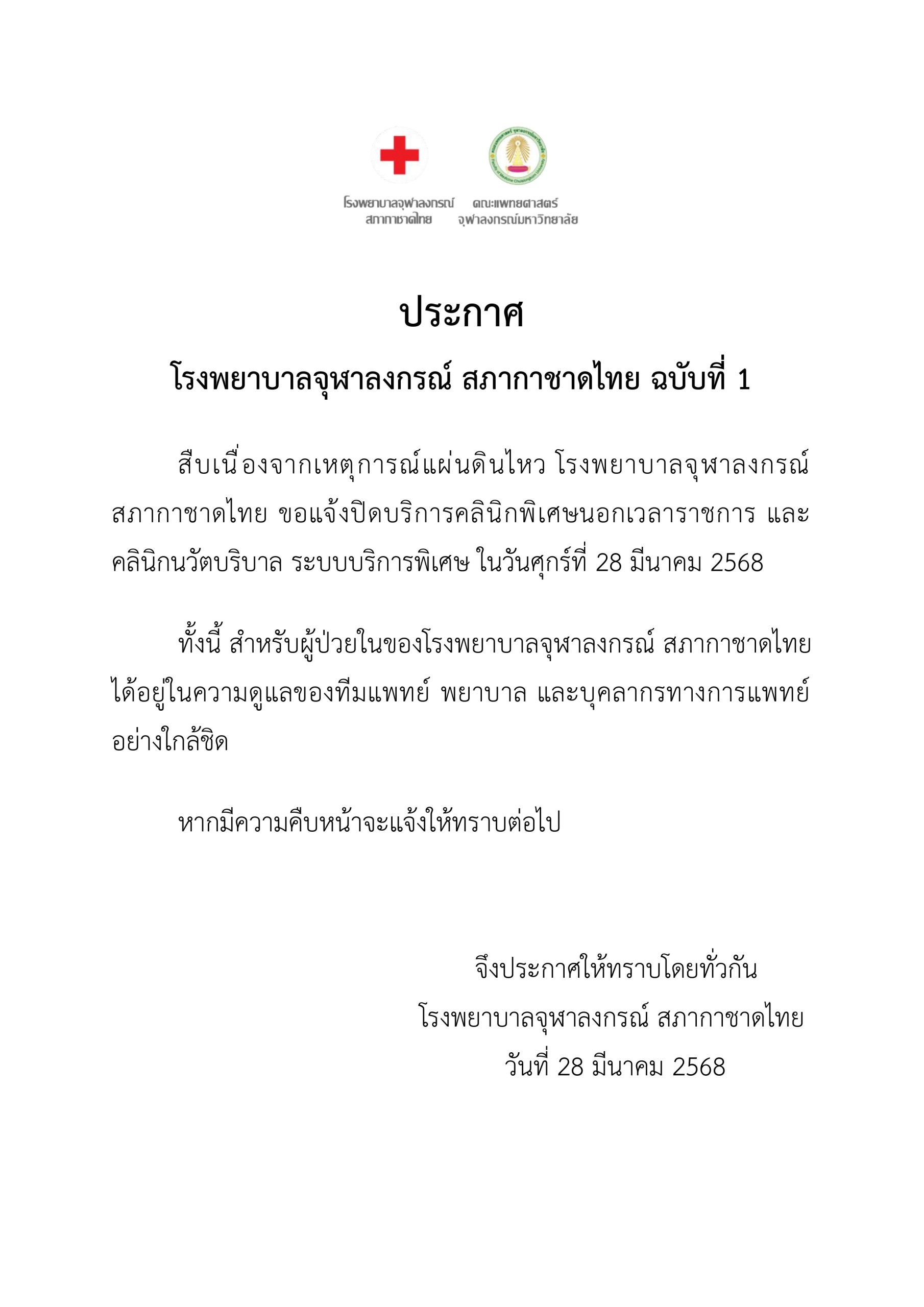 สืบเนื่องจากเหตุการณ์แผ่นดินไหว โรงพยาบาลจุฬาลงกรณ์ สภากาชาดไทย ขอแจ้งปิดบริการคลินิกพิเศษนอกเวลาราชการ และคลินิกนวัตบริบาล ระบบบริการพิเศษ ในวันศุกร์ที่ 28 มีนาคม 2568