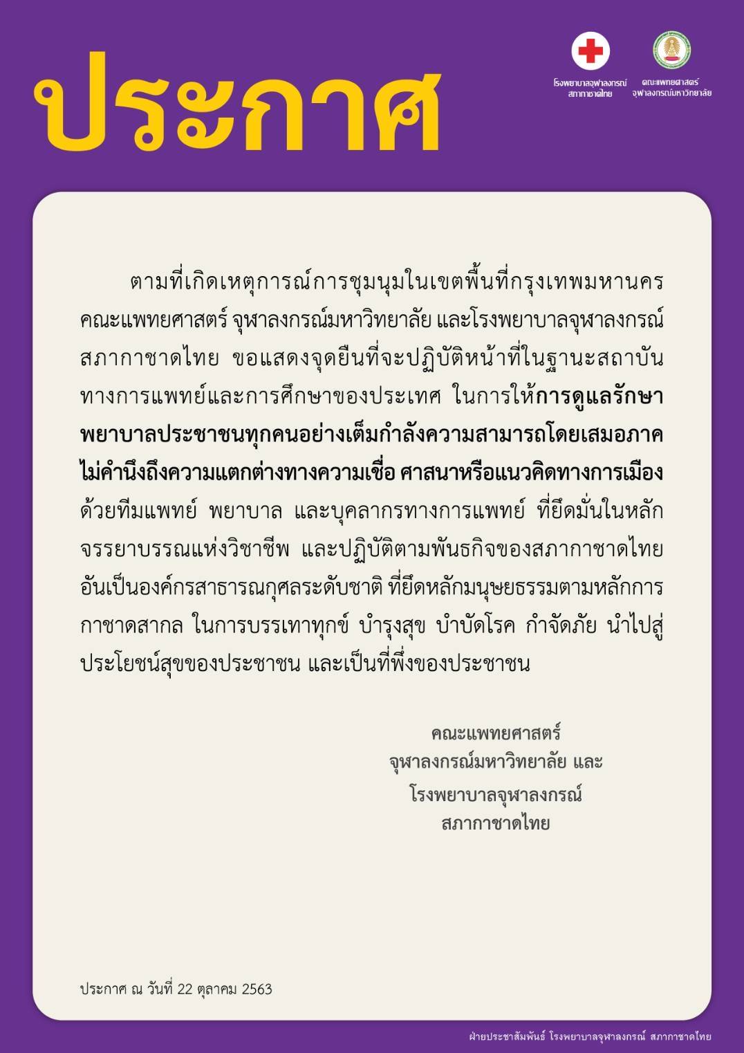 ประกาศ โรงพยาบาลจุฬาลงกรณ์ ขอแสดงจุดยืนที่จะปฏิบัติหน้าที่ในฐานะสถาบัน ทางการแพทย์และการศึกษาของประเทศ ในการให้การดูแลรักษา พยาบาลประชาชนทุกคนอย่างเต็มกำลังความสามารถโดยเสมอภาค ไม่คำนึถึงความแตกต่างทางความเชื่อ ศาสนาหรือแนวคิดทางการเมือง