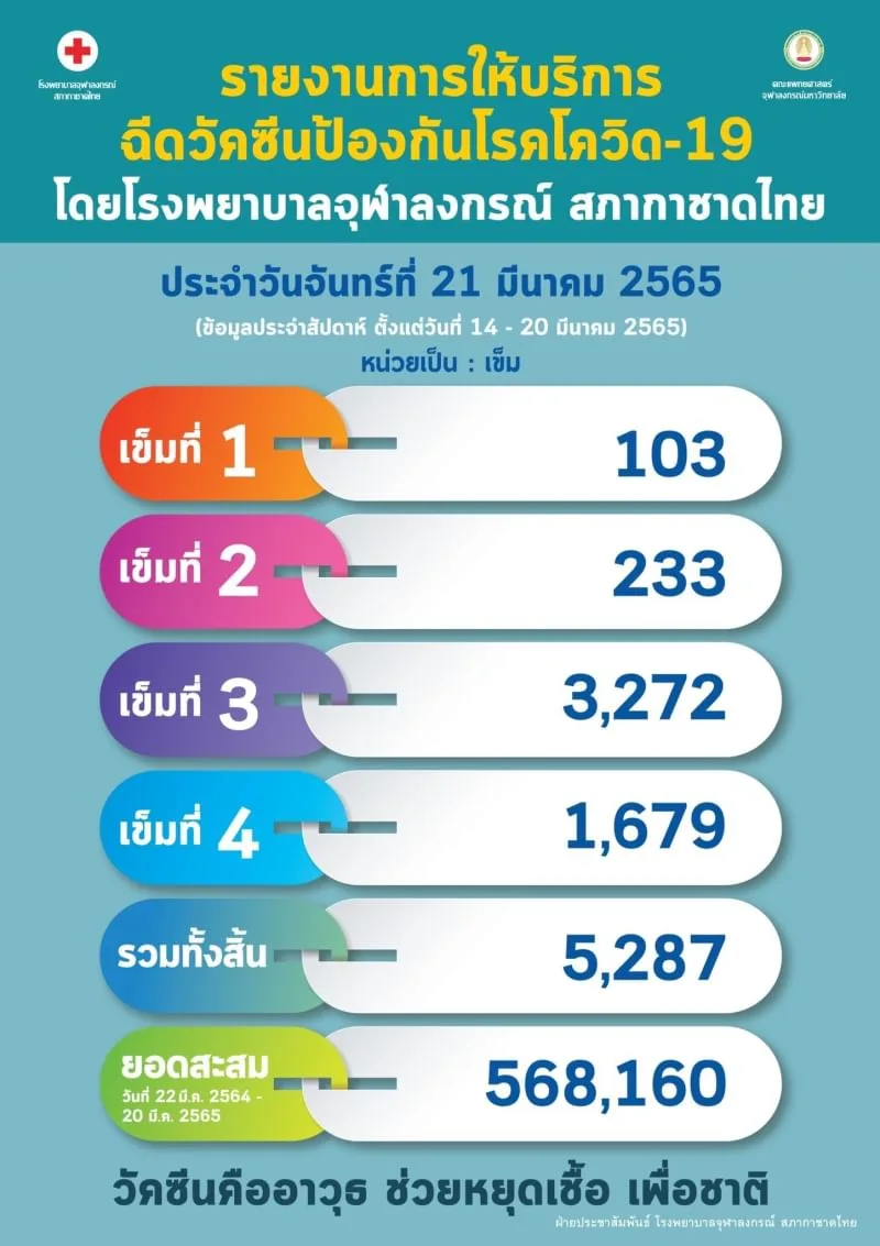 รายงานการให้บริการฉีดวัคซีนป้องกันโรคโควิด-19 โดยโรงพยาบาลจุฬาลงกรณ์ สภากาชาดไทย ประจำวันจันทร์ที่ 21 มีนาคม 2565