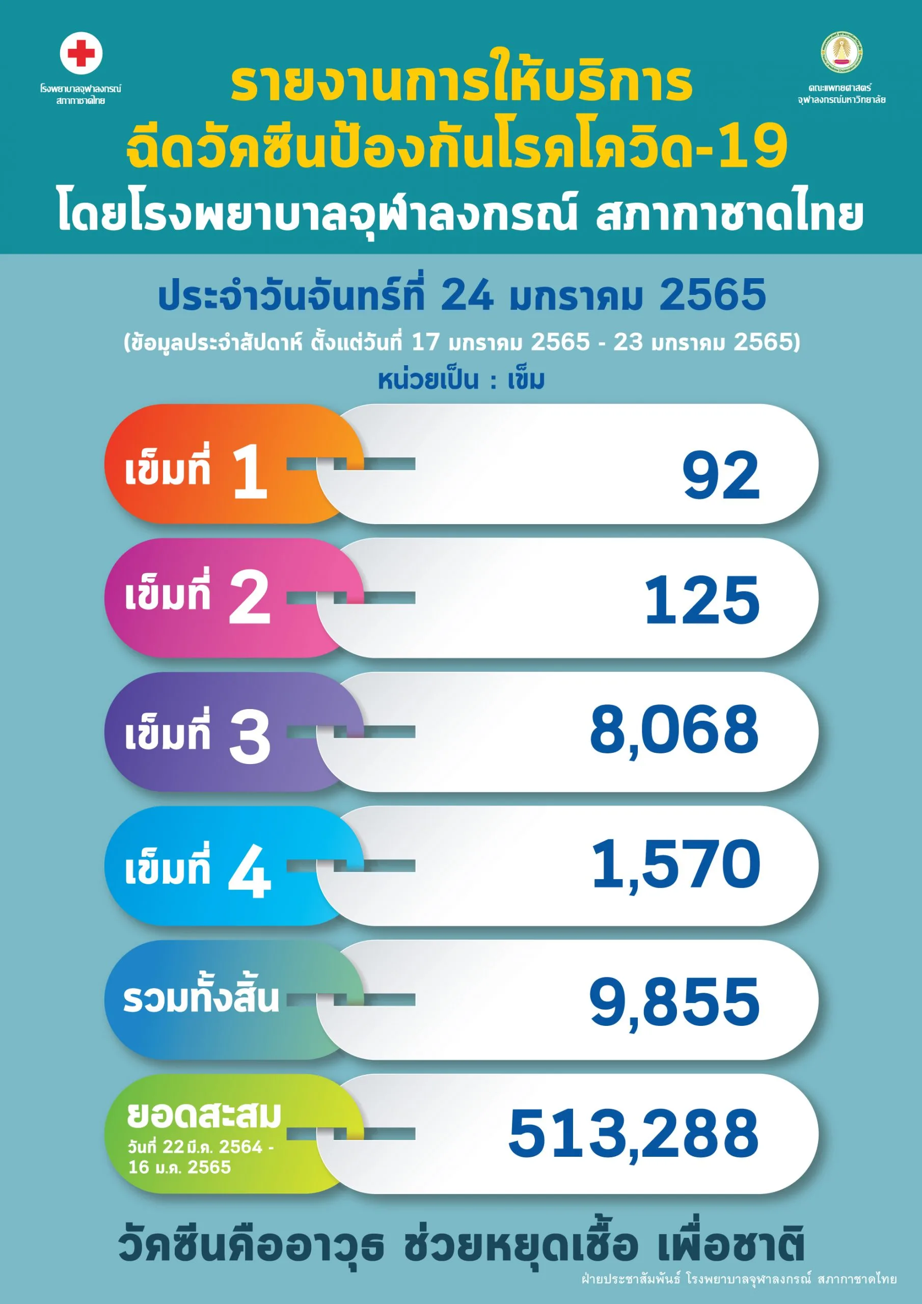 รายงานการให้บริการฉีดวัคซีนป้องกันโรคโควิด-19 โดยโรงพยาบาลจุฬาลงกรณ์ สภากาชาดไทย ประจำวันจันทร์ที่ 24 มกราคม 2565