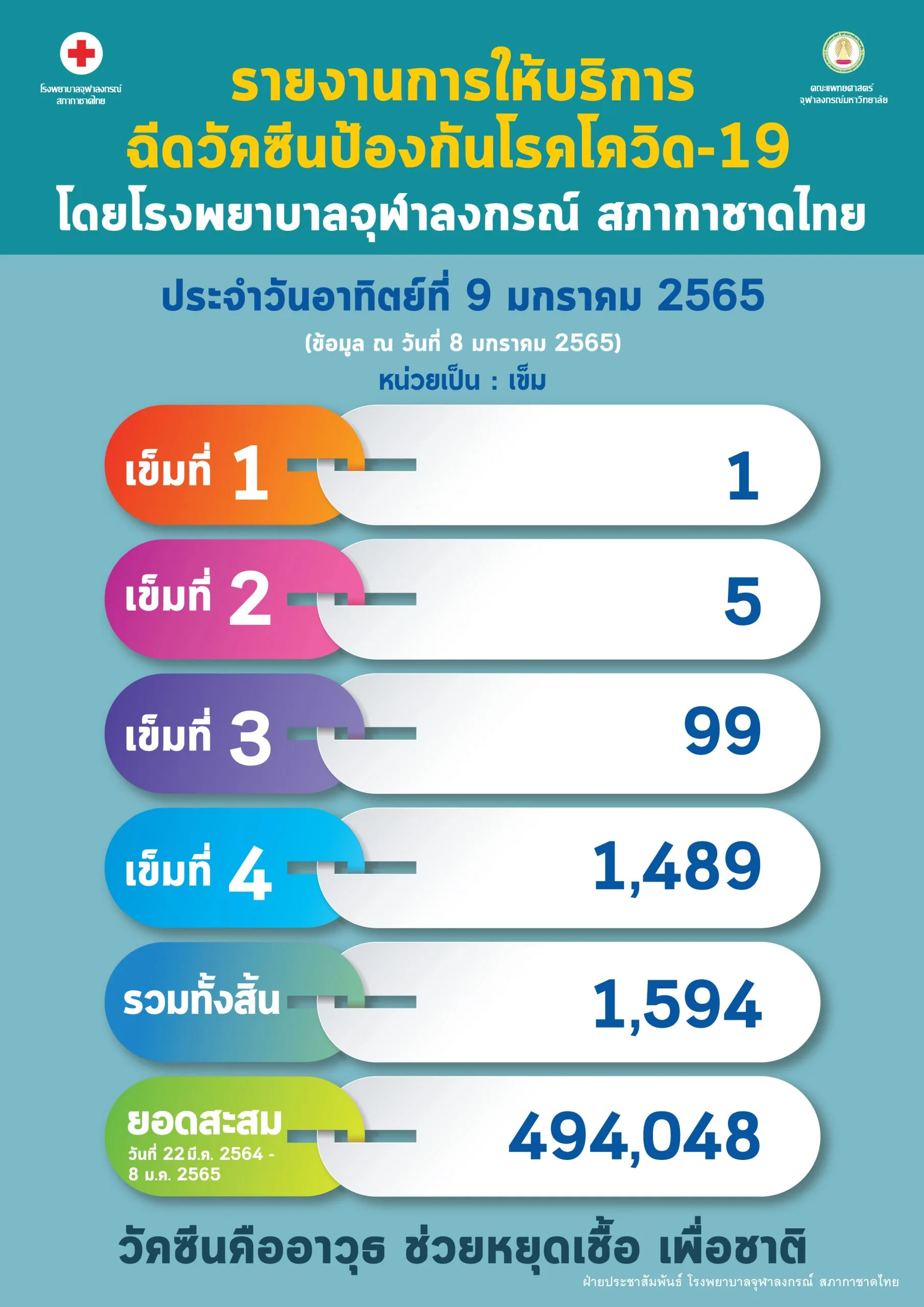 รายงานการให้บริการฉีดวัคซีนป้องกันโรคโควิด-19 โดยโรงพยาบาลจุฬาลงกรณ์ สภากาชาดไทย ประจำวันอาทิตย์ที่ 9 มกราคม 2565
