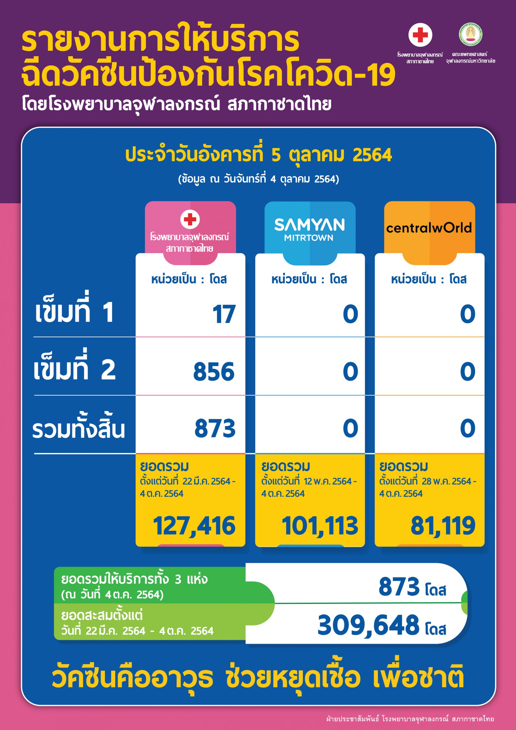 รายงานการให้บริการฉีดวัคซีนป้องกันโรคโควิด-19 โดยโรงพยาบาลจุฬาลงกรณ์ สภากาชาดไทย ประจำวันอังคารที่ 5 ตุลาคม 2564