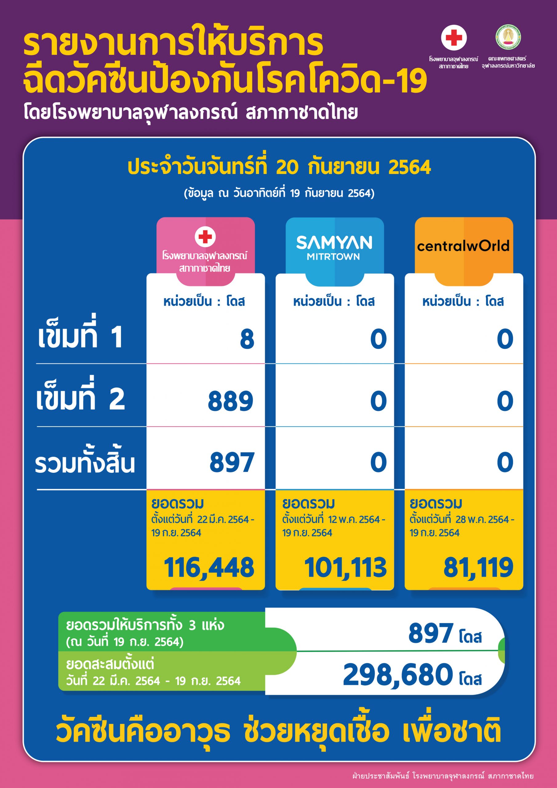 รายงานการให้บริการฉีดวัคซีนป้องกันโรคโควิด-19 โดยโรงพยาบาลจุฬาลงกรณ์ สภากาชาดไทย ประจำวันจันทร์ที่ 20 กันยายน 2564