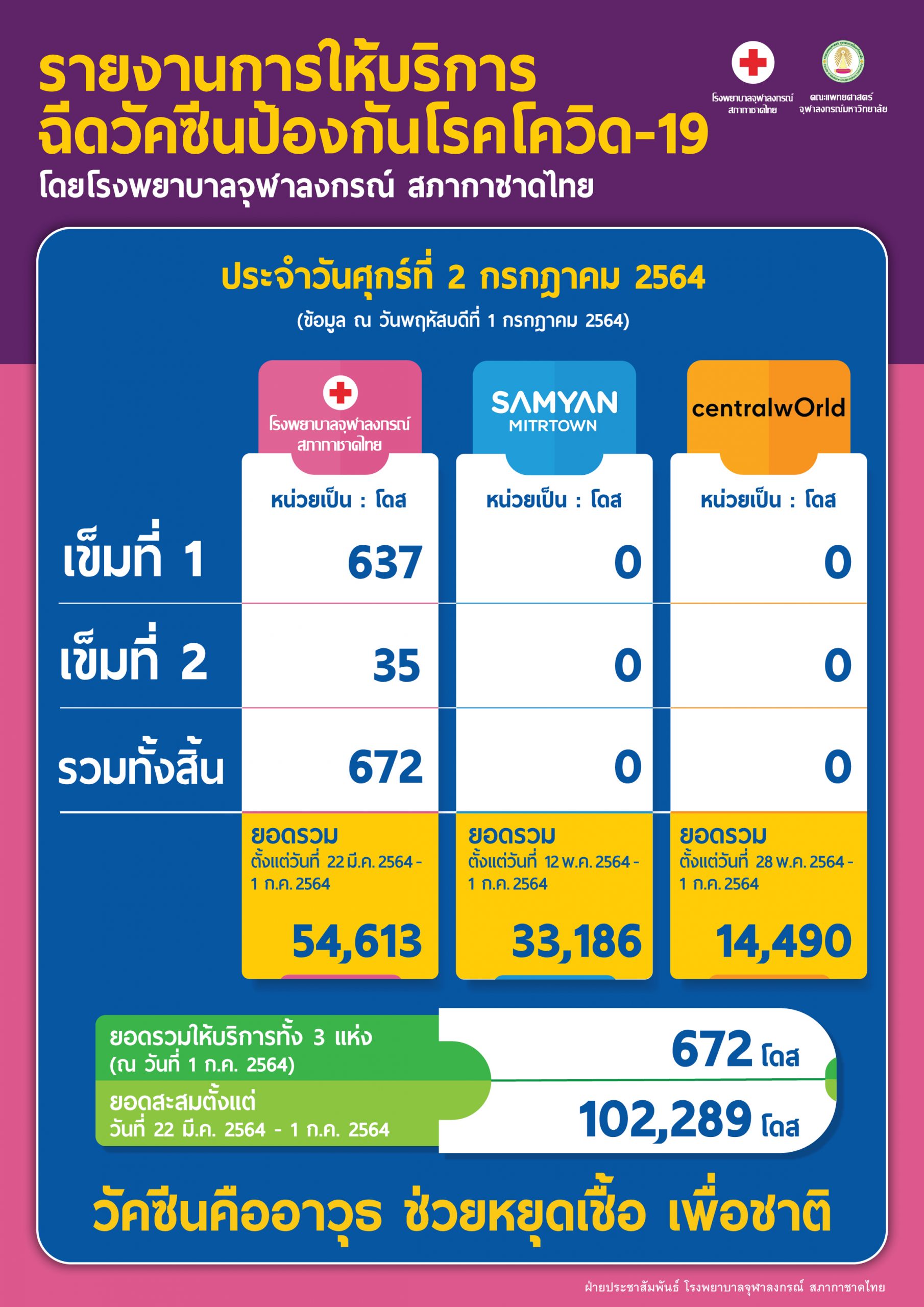 รายงานการให้บริการฉีดวัคซีนป้องกันโรคโควิด-19 โดยโรงพยาบาลจุฬาลงกรณ์ สภากาชาดไทย ประจำวันศุกร์ที่ 2 กรกฎาคม 2564