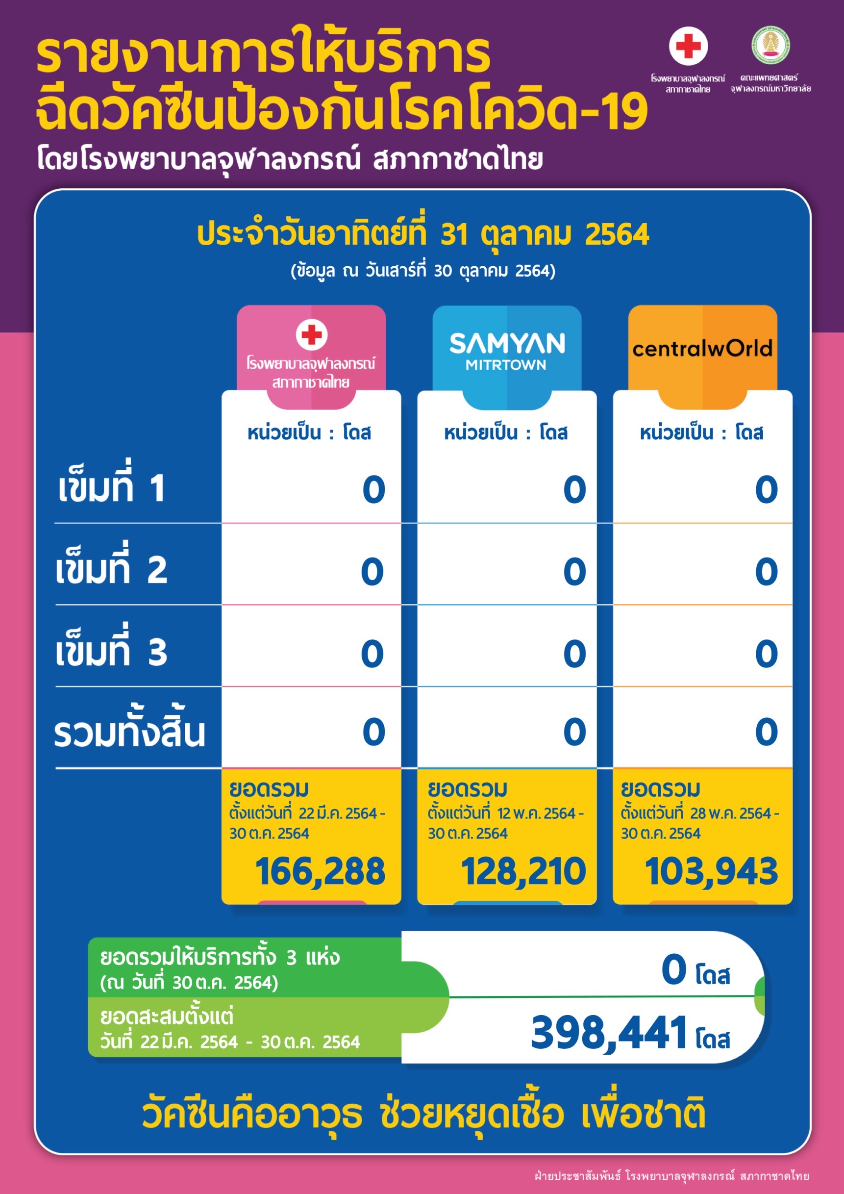 รายงานการให้บริการ ฉีดวัคซีนป้องกันโรคโควิด-19 โดยโรงพยาบาลจุฬาลงกรณ์ สภากาชาดไทย ประจำวันอาทิตย์ที่ 31 ตุลาคม 2564