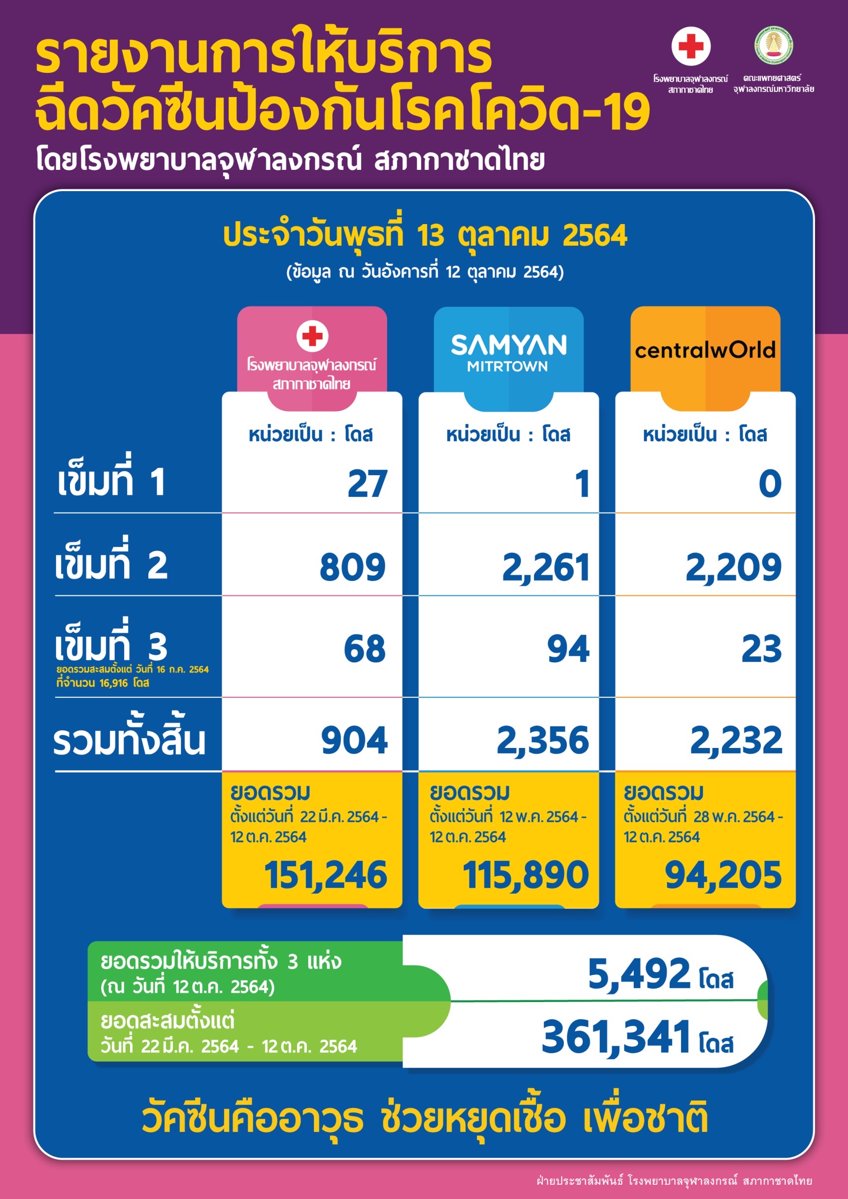 รายงานการให้บริการ ฉีดวัคซีนป้องกันโรคโควิด-19 โดยโรงพยาบาลจุฬาลงกรณ์ สภากาชาดไทย ประจำวันพุธที่ 13 ตุลาคม 2564