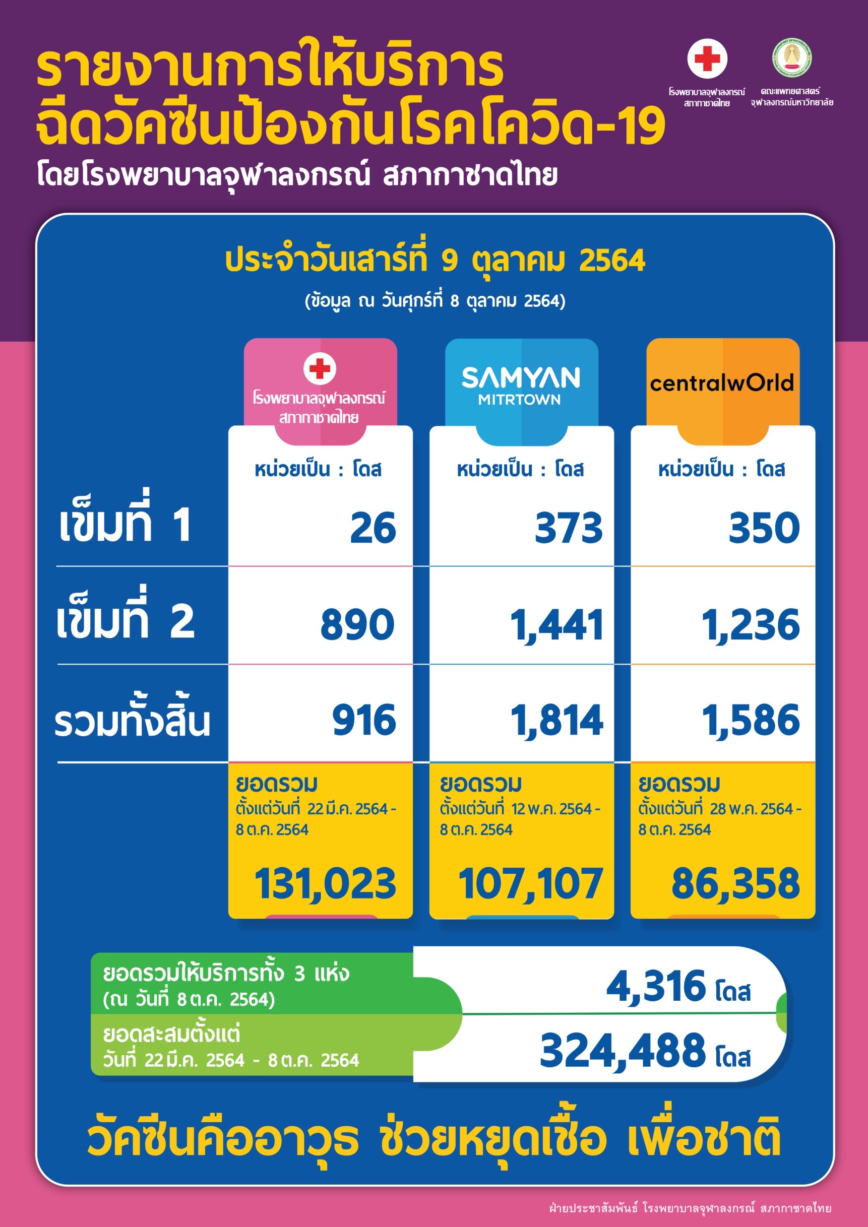 รายงานการให้บริการ ฉีดวัคซีนป้องกันโรคโควิด-19 โดยโรงพยาบาลจุฬาลงกรณ์ สภากาชาดไทย ประจำวันเสาร์ที่ 9 ตุลาคม 2564