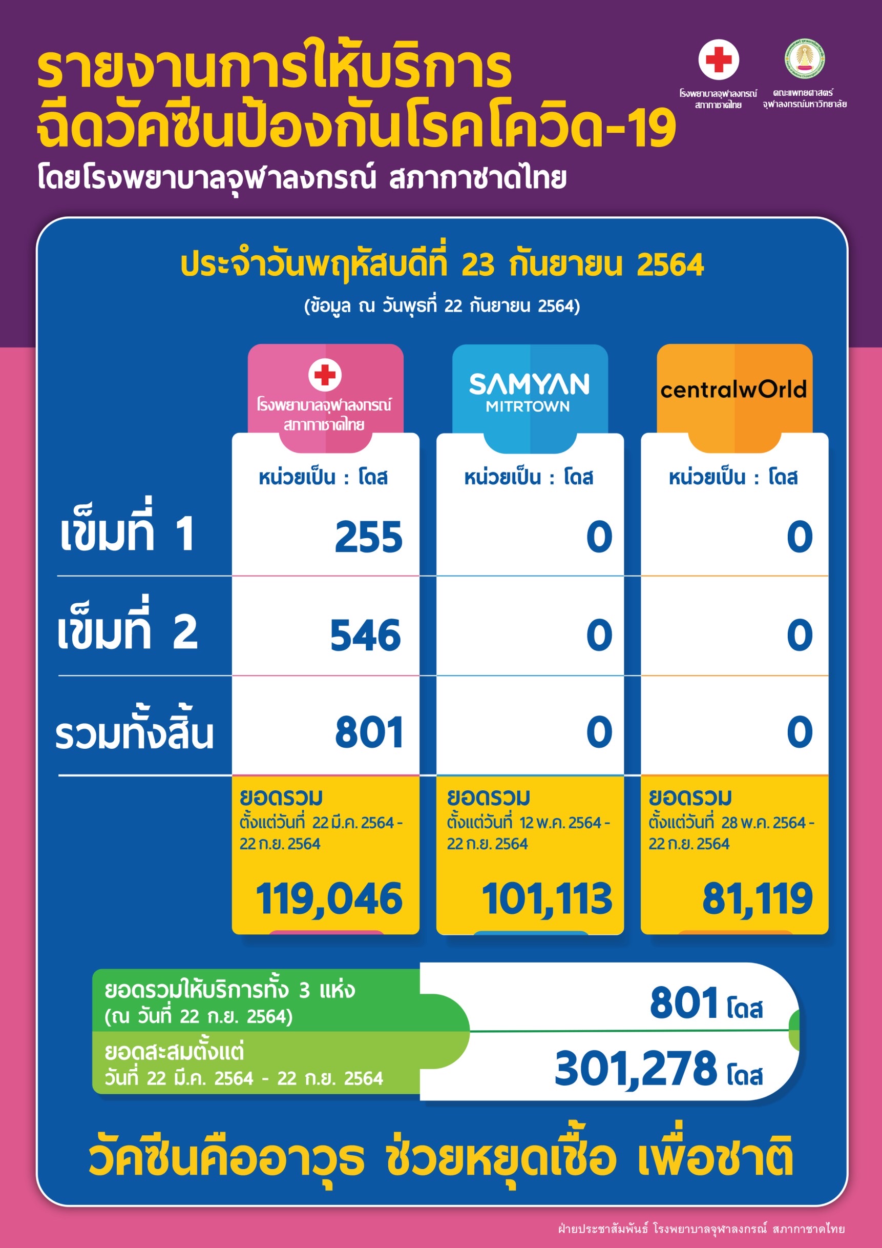 รายงานการให้บริการ ฉีดวัคซีนป้องกันโรคโควิด-19 โดยโรงพยาบาลจุฬาลงกรณ์ สภากาชาดไทย ประจำวันพฤหัสบดีที่ 23 กันยายน 2564