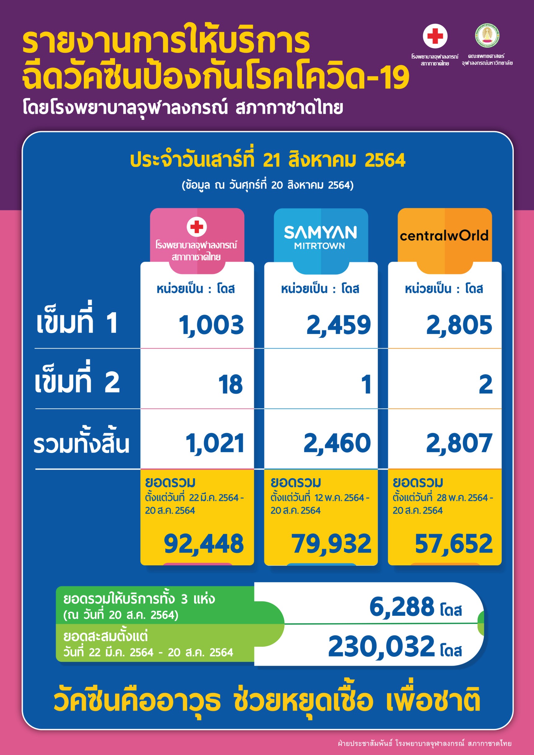 รายงานการให้บริการ ฉีดวัคซีนป้องกันโรคโควิด-19 โดยโรงพยาบาลจุฬาลงกรณ์ สภากาชาดไทย ประจำวันเสาร์ที่ 21 สิงหาคม 2564
