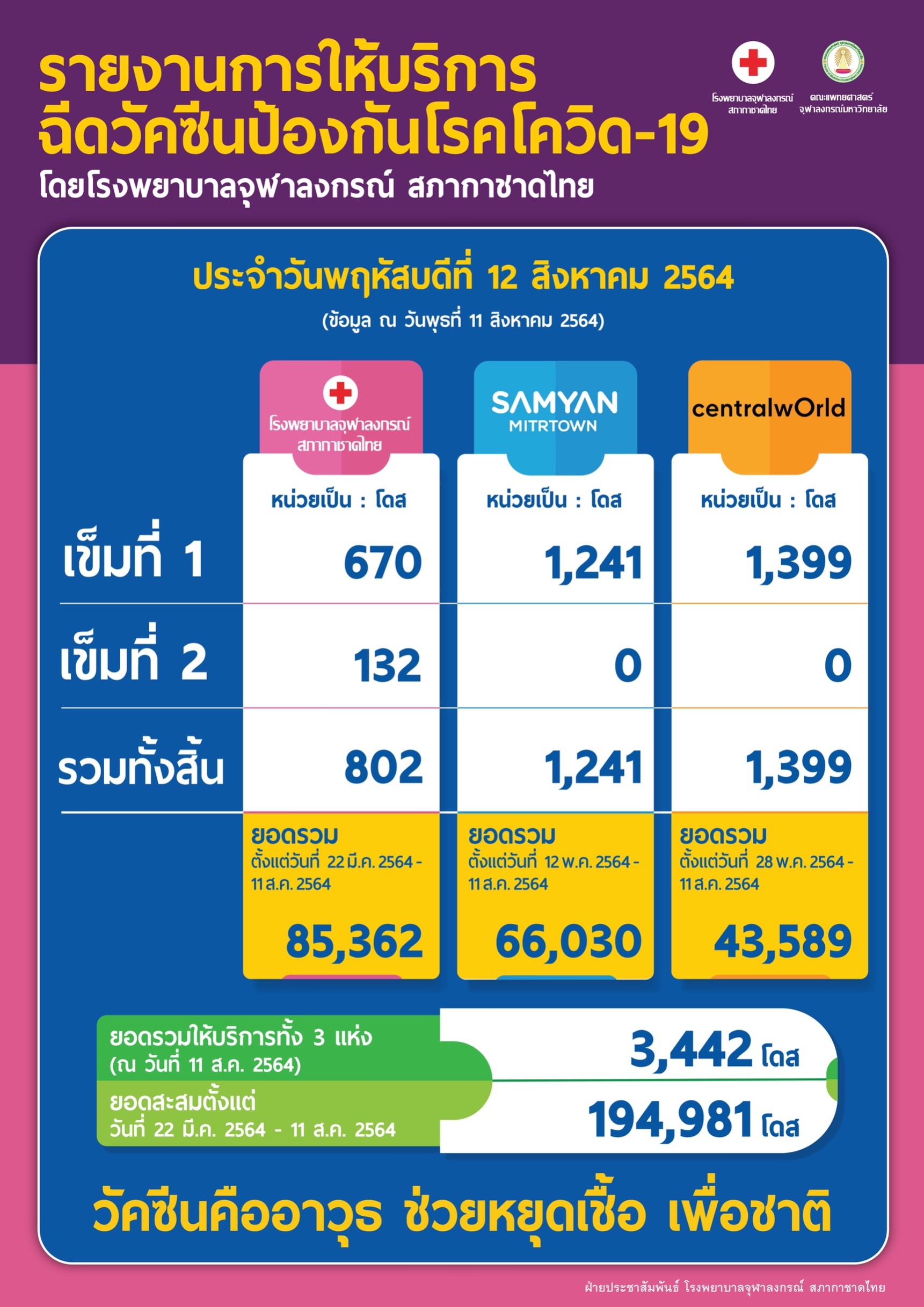 รายงานการให้บริการ ฉีดวัคซีนป้องกันโรคโควิด-19 โดยโรงพยาบาลจุฬาลงกรณ์ สภากาชาดไทย ประจำวันพฤหัสบดีที่ 12 สิงหาคม 2564