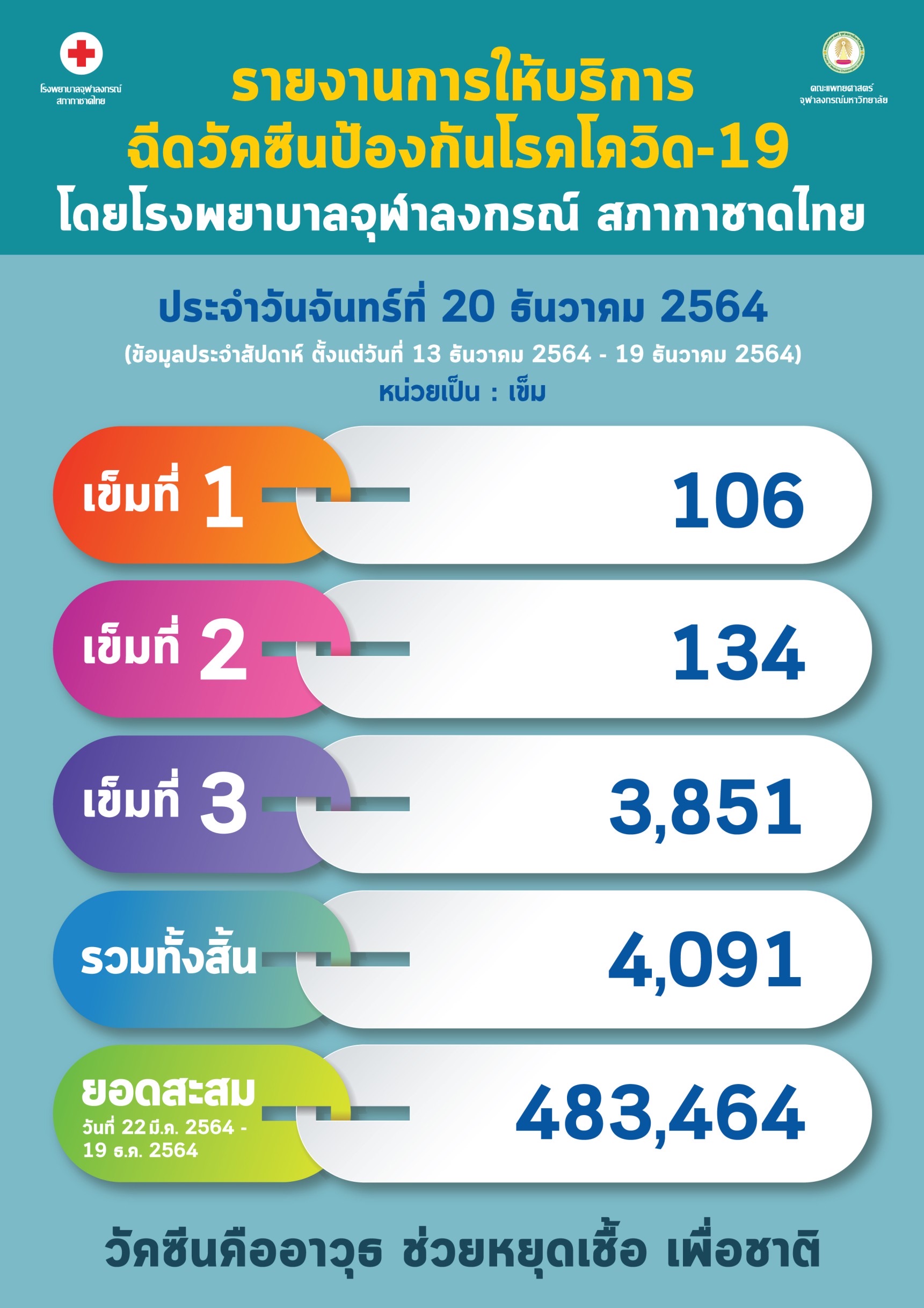 รายงานการให้บริการ ฉีดวัคซีนป้องกันโรคโควิด-19 โดยโรงพยาบาลจุฬาลงกรณ์ สภากาชาดไทย ประจำวันจันทร์ที่ 20 ธันวาคม 2564