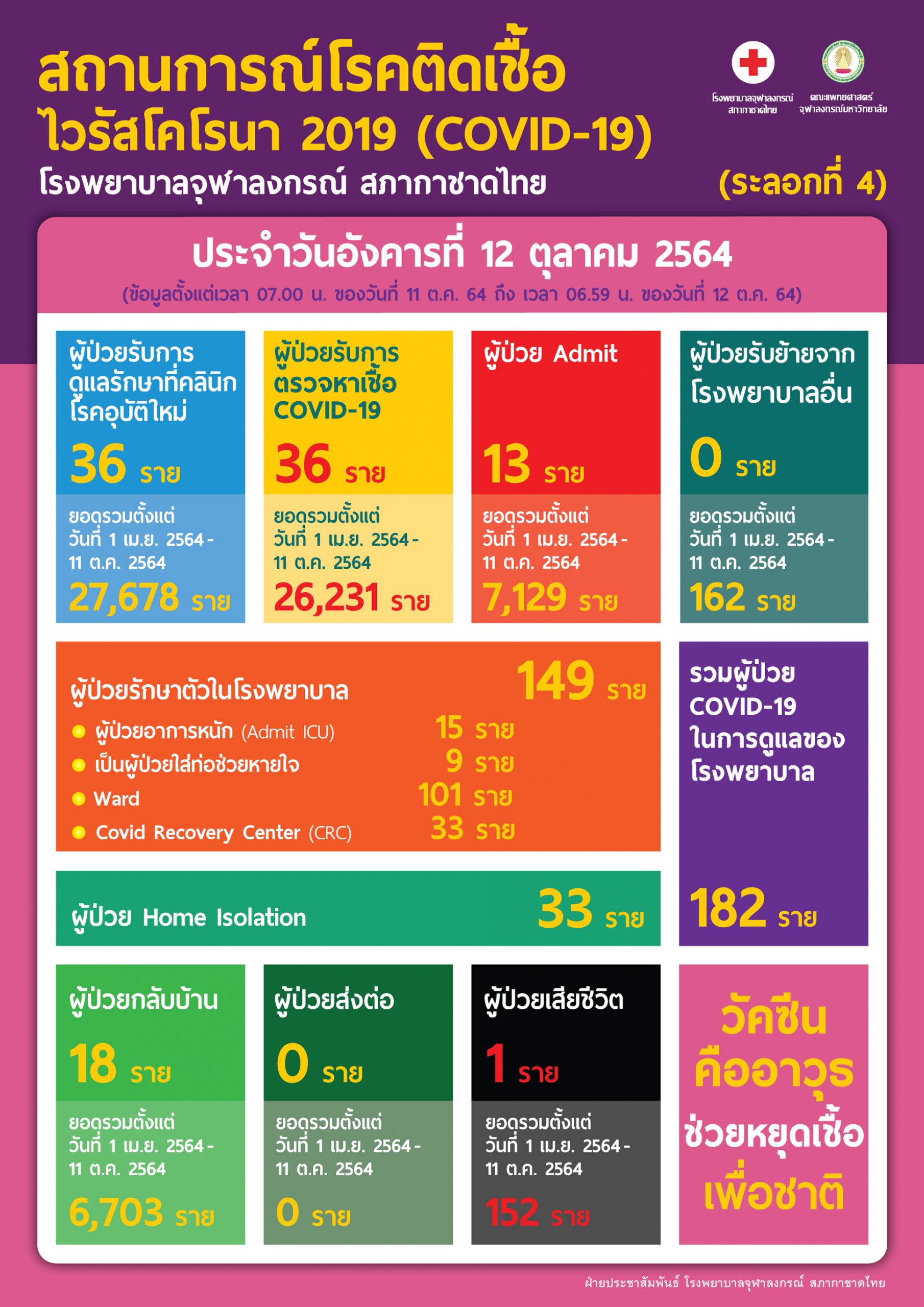 สถานการณ์โรคติดเชื้อไวรัสโคโรนา 2019 (COVID-19) (ระลอกที่ 4) โรงพยาบาลจุฬาลงกรณ์ สภากาชาดไทย ประจำวันอังคารที่ 12 ตุลาคม 2564