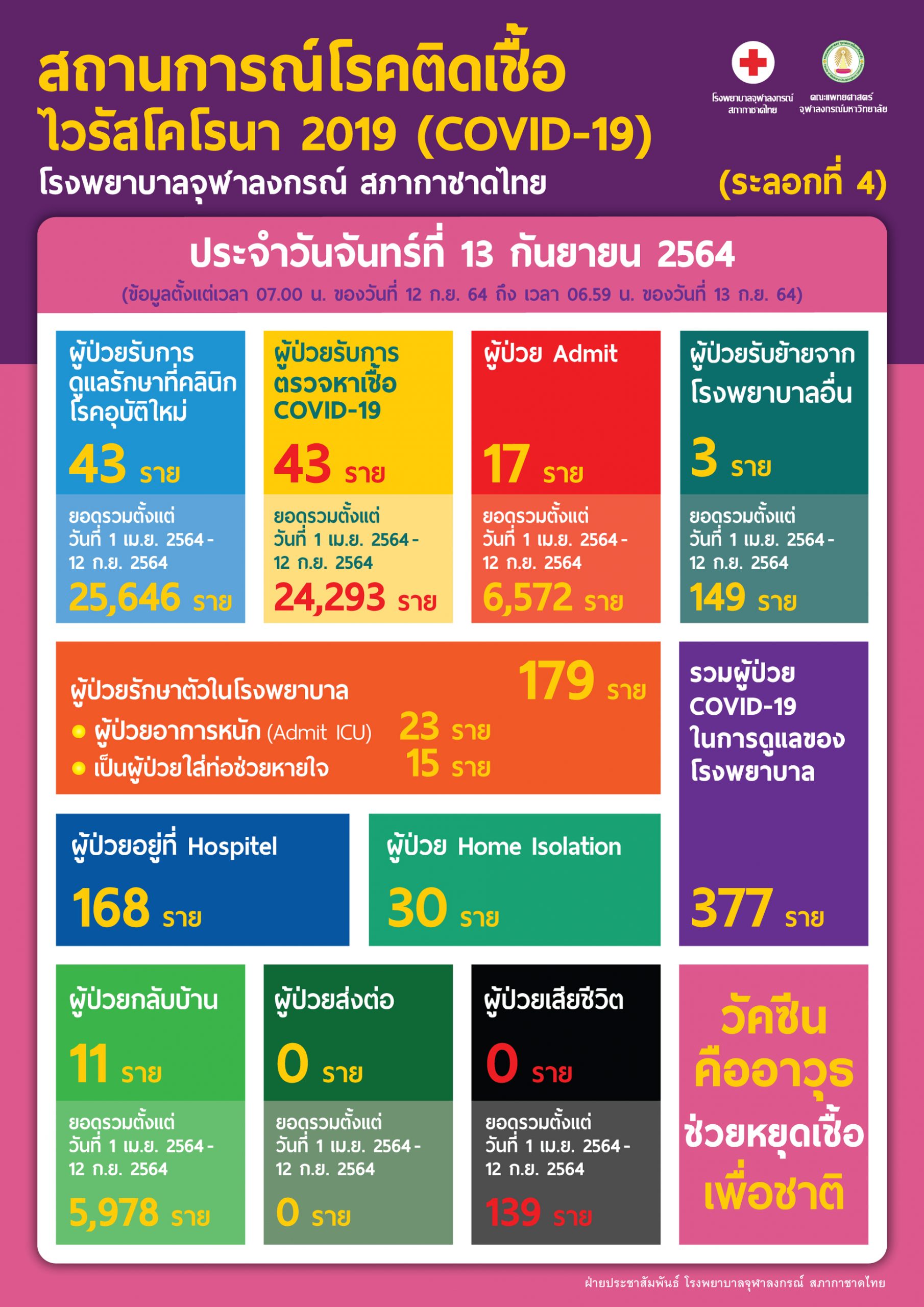 สถานการณ์โรคติดเชื้อไวรัสโคโรนา 2019 (COVID-19) (ระลอกที่ 4) โรงพยาบาลจุฬาลงกรณ์ สภากาชาดไทย ประจำวันจันทร์ที่ 13 กันยายน 2564