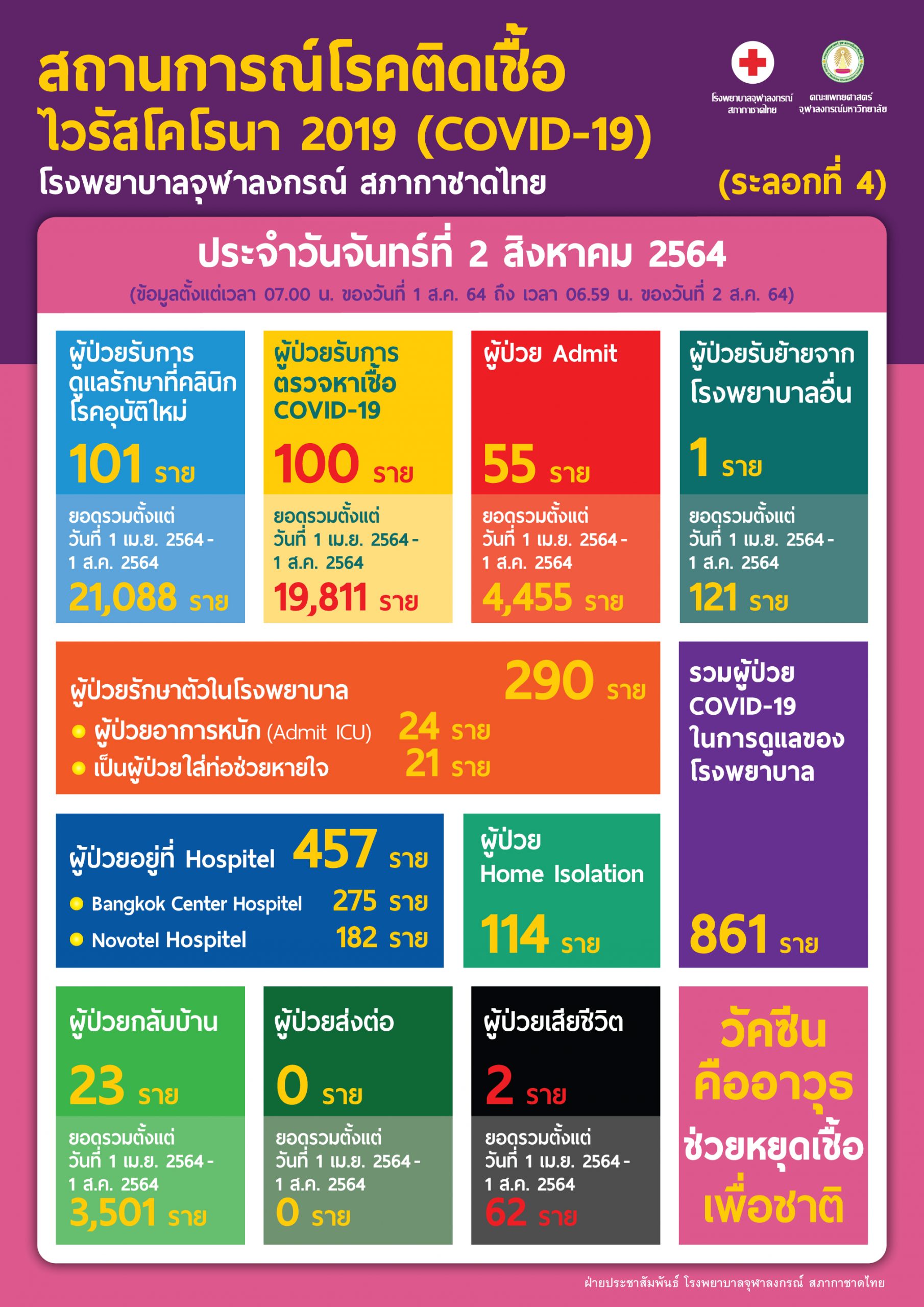 สถานการณ์โรคติดเชื้อไวรัสโคโรนา 2019 (COVID-19) (ระลอกที่ 4) โรงพยาบาลจุฬาลงกรณ์ สภากาชาดไทย ประจำวันจันทร์ที่ 2 สิงหาคม 2564