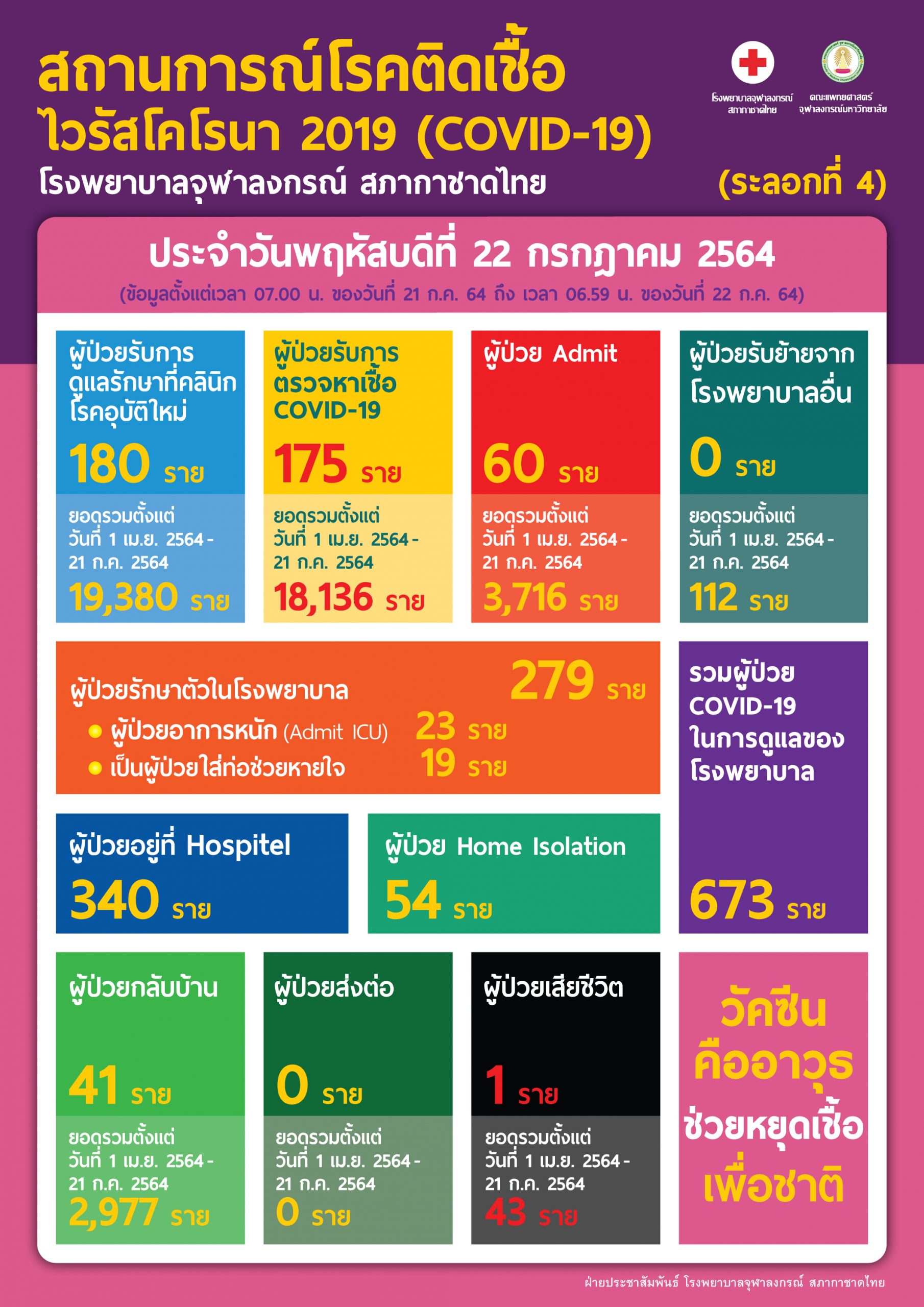 สถานการณ์โรคติดเชื้อไวรัสโคโรนา 2019 (COVID-19) (ระลอกที่ 4) โรงพยาบาลจุฬาลงกรณ์ สภากาชาดไทย ประจำวันพฤหัสบดีที่ 22 กรกฎาคม 2564