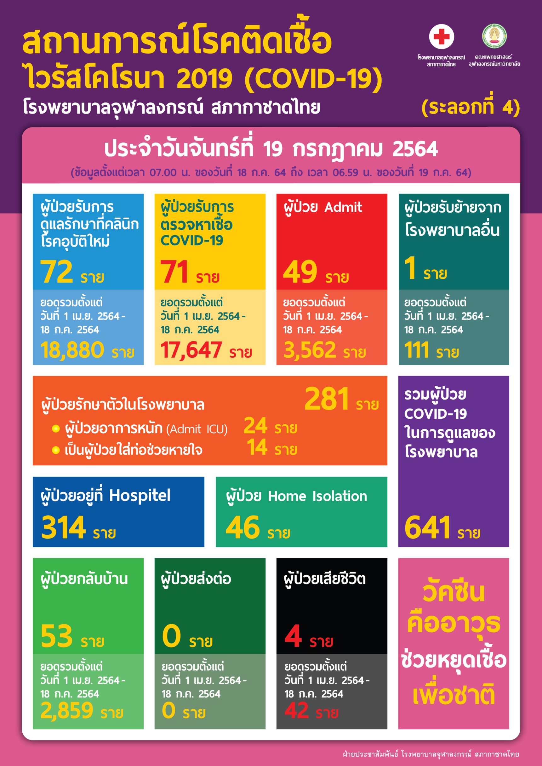 สถานการณ์โรคติดเชื้อไวรัสโคโรนา 2019 (COVID-19) (ระลอกที่ 4) โรงพยาบาลจุฬาลงกรณ์ สภากาชาดไทย ประจำ วันจันทร์ที่ 19 กรกฎาคม 2564