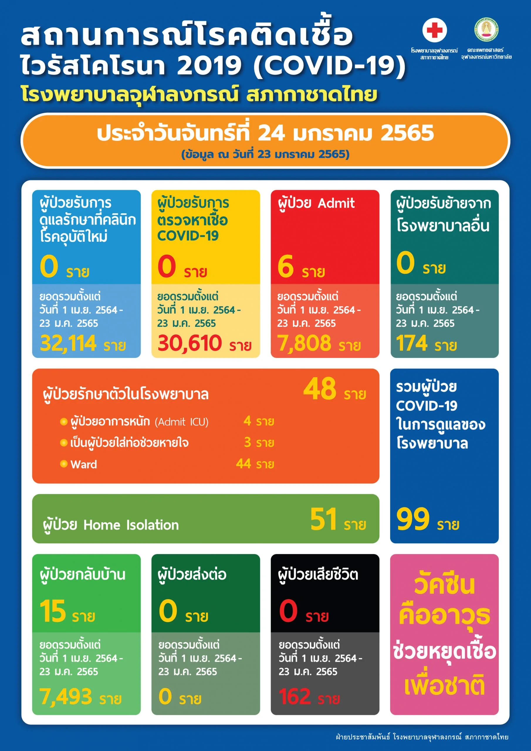 สถานการณ์โรคติดเชื้อไวรัสโคโรนา 2019 (COVID-19) โรงพยาบาลจุฬาลงกรณ์ สภากาชาดไทย ประจำวันจันทร์ที่ 24 มกราคม 2565