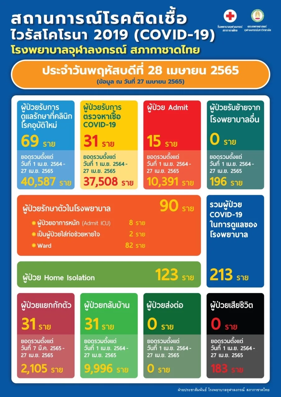 สถานการณ์โรคติดเชื้อ ไวรัสโคโรนา 2019 (COVID-19) โรงพยาบาลจุฬาลงกรณ์ สภากาชาดไทย ประจำวันพฤหัสบดีที่ 28 เมษายน 2565