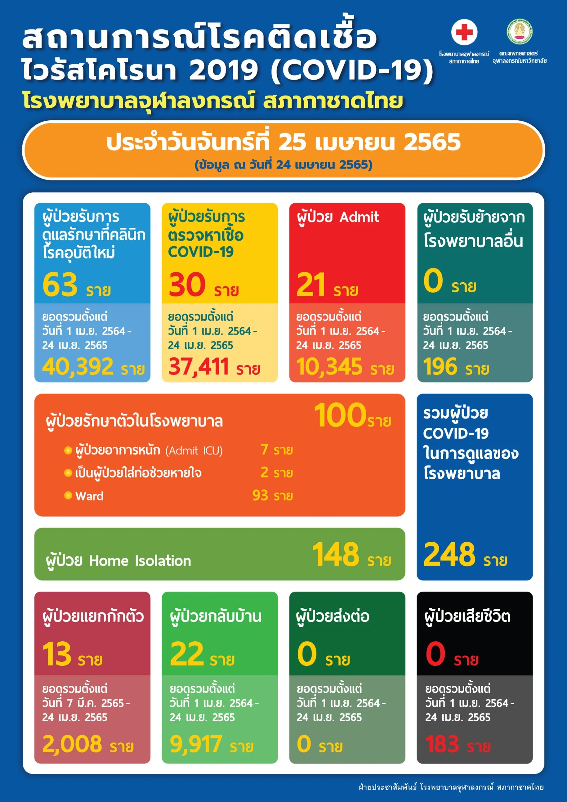 สถานการณ์โรคติดเชื้อ ไวรัสโคโรนา 2019 (COVID-19) โรงพยาบาลจุฬาลงกรณ์ สภากาชาดไทย ประจำวันจันทร์ที่ 25 เมษายน 2565