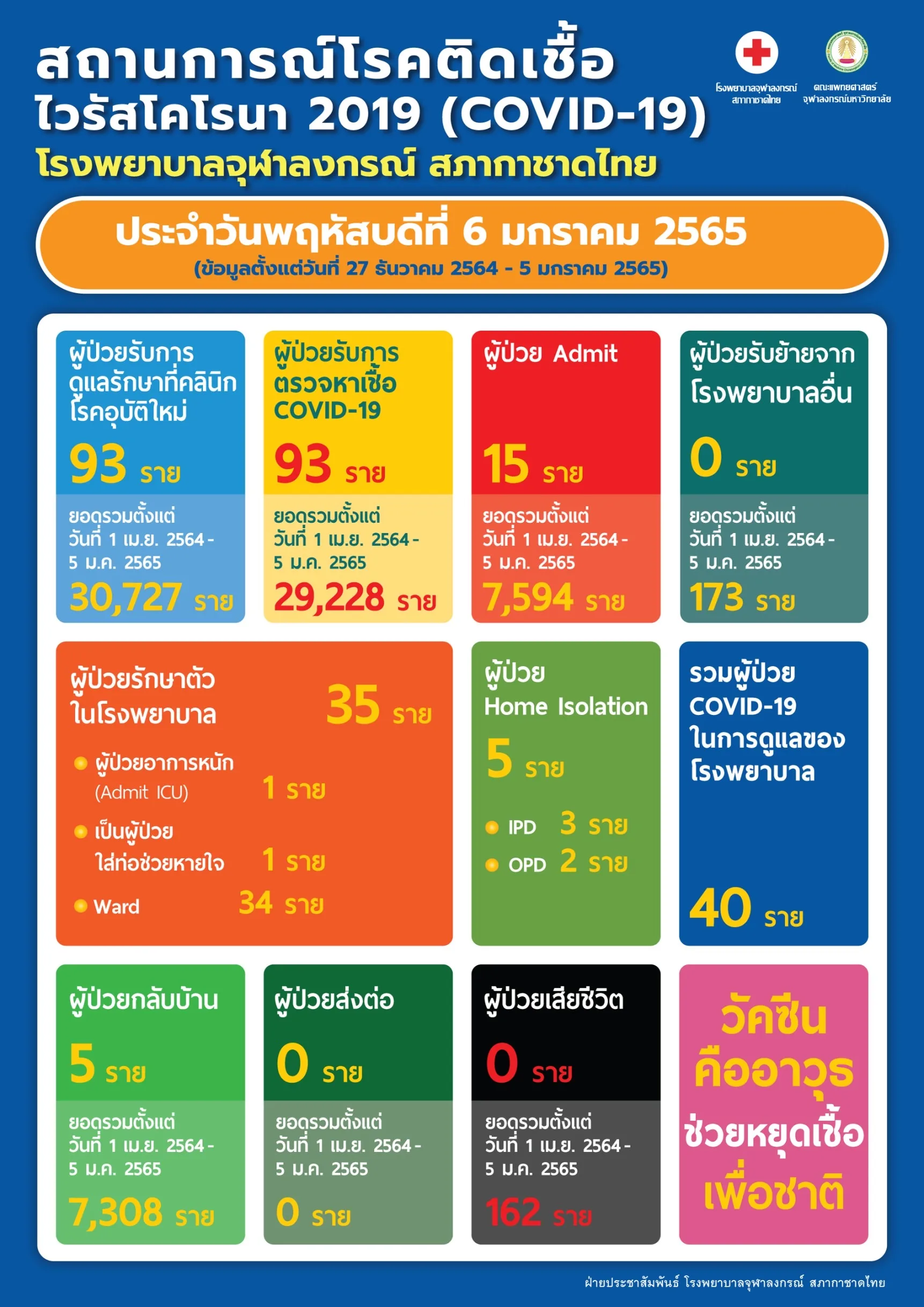 สถานการณ์โรคติดเชื้อ ไวรัสโคโรนา 2019 (COVID-19) โรงพยาบาลจุฬาลงกรณ์ สภากาชาดไทย ประจำวันพฤหัสบดีที่ 6 มกราคม 2565