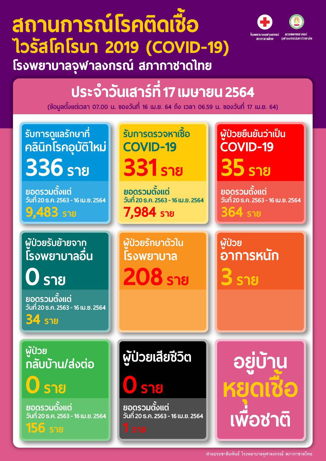 สถานการณ์โรคติดเชื้อ ไวรัสโคโรนา 2019 (COVID-19) โรงพยาบาลจุฬาลงกรณ์ สภากาชาดไทย ประจำวันเสาร์ที่ 17 เมษายน 2564