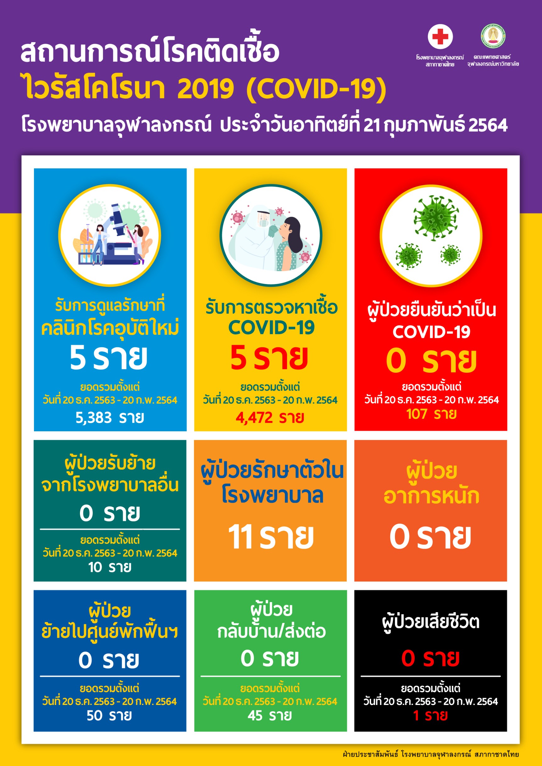 สถานการณ์โรคติดเชื้อ ไวรัสโคโรนา 2019 (COVID-19) โรงพยาบาลจุฬาลงกรณ์ ประจำวันอาทิตย์ที่ 21 กุมภาพันธ์ 2564
