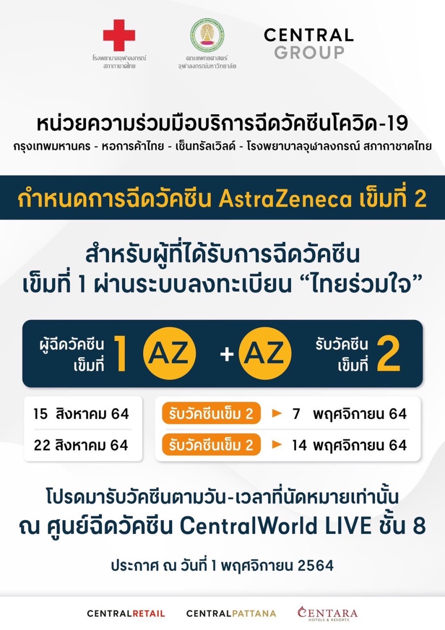 หน่วยความร่วมมือบริการฉีดวัคซีนโควิด-19 กรุงเทพมหานคร – หอการค้าไทย – เซ็นทรัลเวิลด์ – โรงพยาบาลจุฬาลงกรณ์ สภากาชาดไทย กำหนดการฉีดวัคซีน AstraZeneca เข็มที่ 2 สำหรับผู้ที่ได้รับการฉีดวัคซีน เข็มที่ 1 ผ่านระบบลงทะเบียน “ไทยร่วมใจ”
