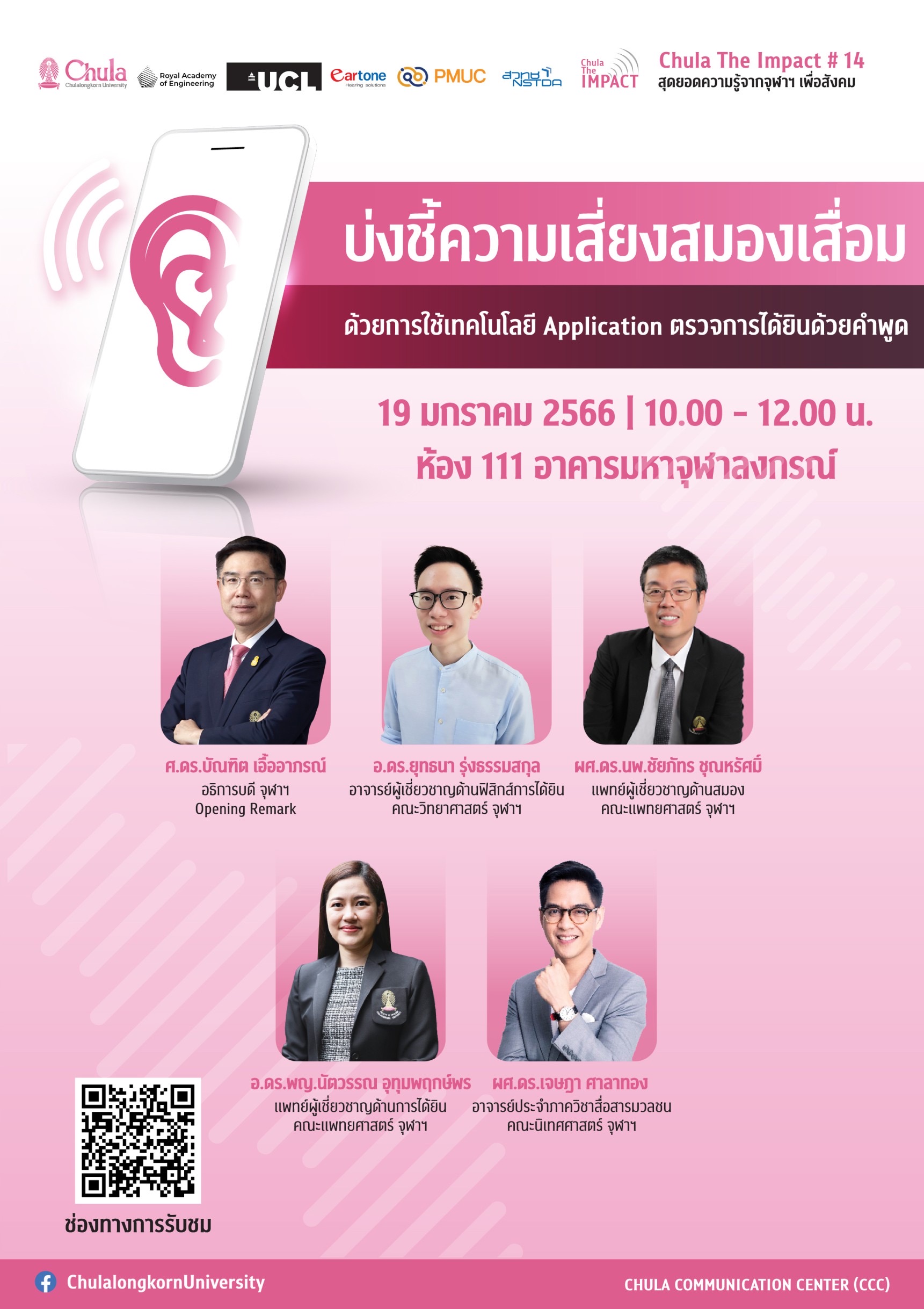 เสวนา CHULA the Impact ครั้งที่ 14 เรื่อง “บ่งชี้ความเสี่ยงสมองเสื่อม ด้วยการใช้เทคโนโลยี Application ตรวจการได้ยินด้วยคำพูด”